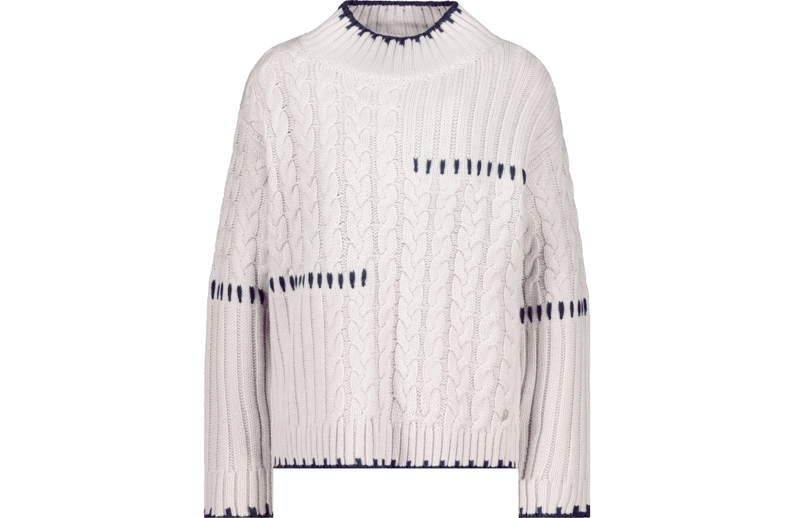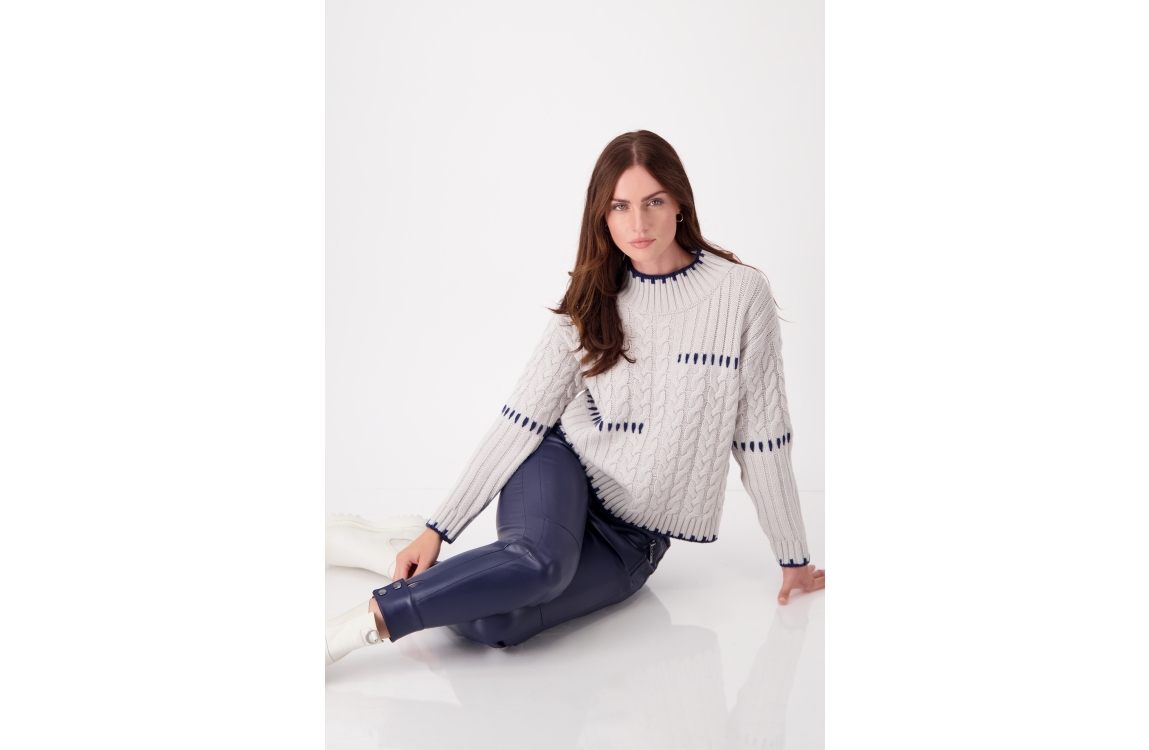 Monari trui 807464. Dit rechtvallend model is voorzien van een turtle neck en heeft lange mouwen. Deze grijze gebreide trui van Monari is bewerkt met een kabelmotief afgewerkt met de kleur blauw.