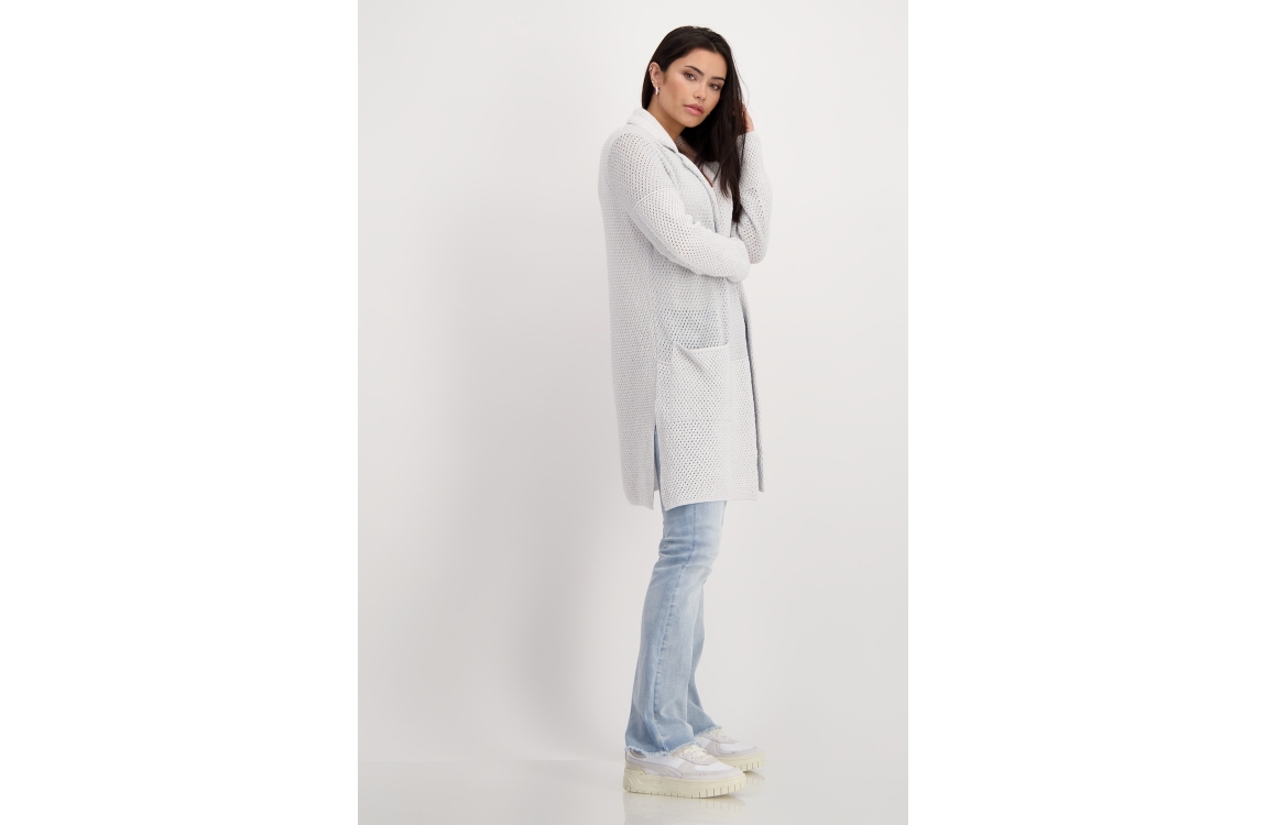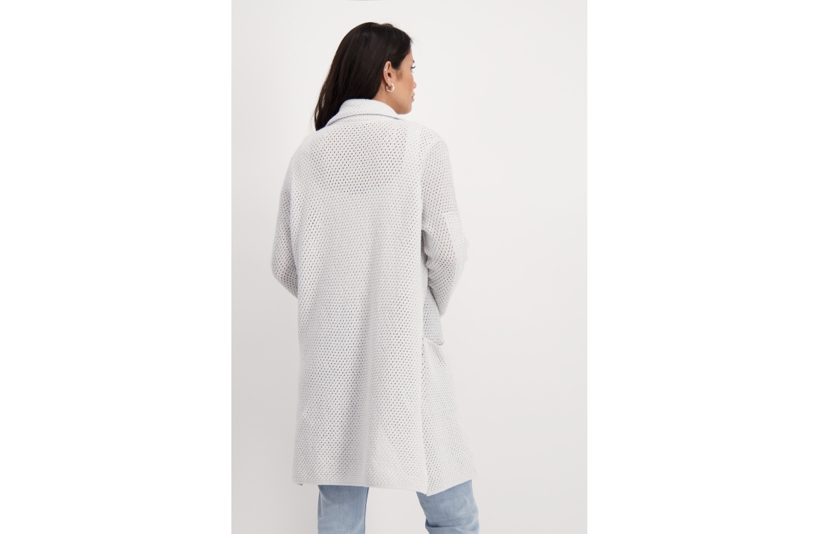 Monari vest 408292. Dit wijdvallende model is voorzien van een revers kraag en heeft lange mouwen. Dit zilveren vest van Monari is uitgevoerd in een opengewerkte kwaliteit voorzien van een lurex draad. Dit model is afgewerkt met twee steekzakken aan de voorzijde.