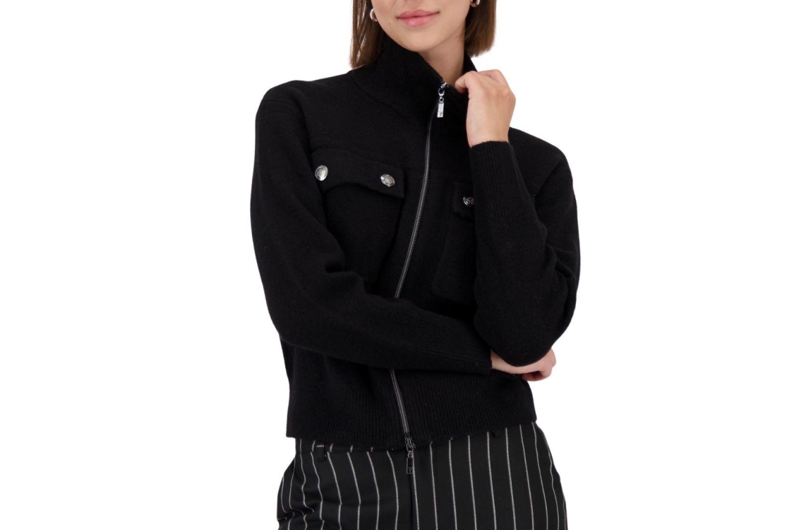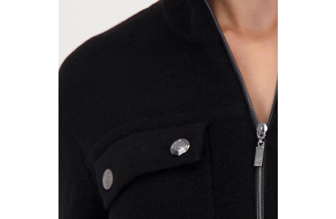 Monari vest 809617. Dit rechtvallende model heeft een opstaande kraag en lange mouwen. Deze zwarte vest van Monari sluit door middel van een rits en beschikt over zakken op het voorpand met zilverkleurige knopen.