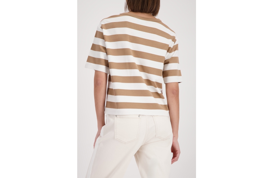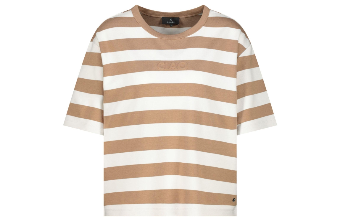 Monari Sweatshirt 547 Biscotti ringel. Dit rechtvallende model is voorzien van een ronde hals en heeft korte mouwen. Deze bruin gestreepte top van Monari is op de voorkant bewerkt met een de opdruk 'ciao'.