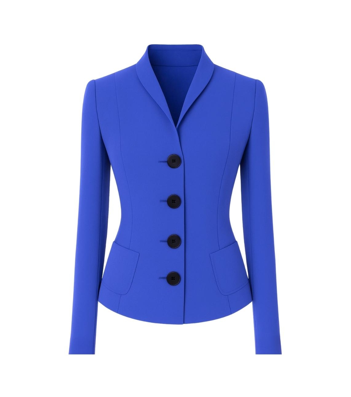 MOQ blazer Mare. Dit aangesloten model heeft een opstaande kraag en lange mouwen. Deze kobalt blauwe blazer van MOQ is aan de voorzijde voorzien van twee opgestikte zakken en sluit door middel van grote knopen. Het model is uitgevoerd in een travel jersey.