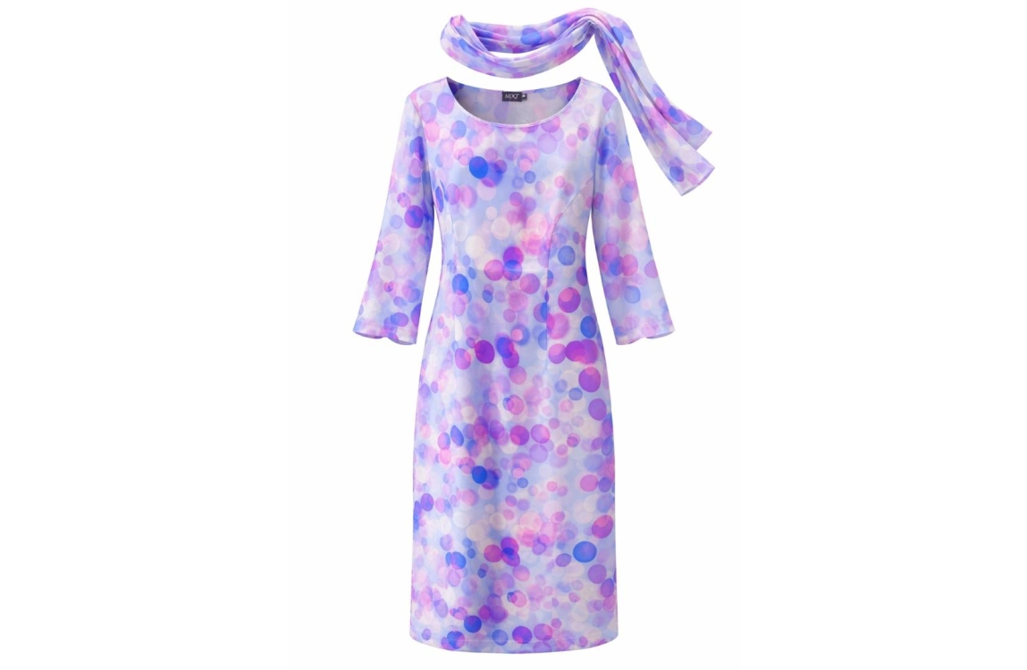 MOQ jurk VI. Dit rechtvallend model heeft een ronde hals en driekwart mouwen. Deze paars/blauwejurk van MOQ heeft een bijpassende ceintuur voor een taille-accentuering en een split achter. De stof is een travel jersey.
