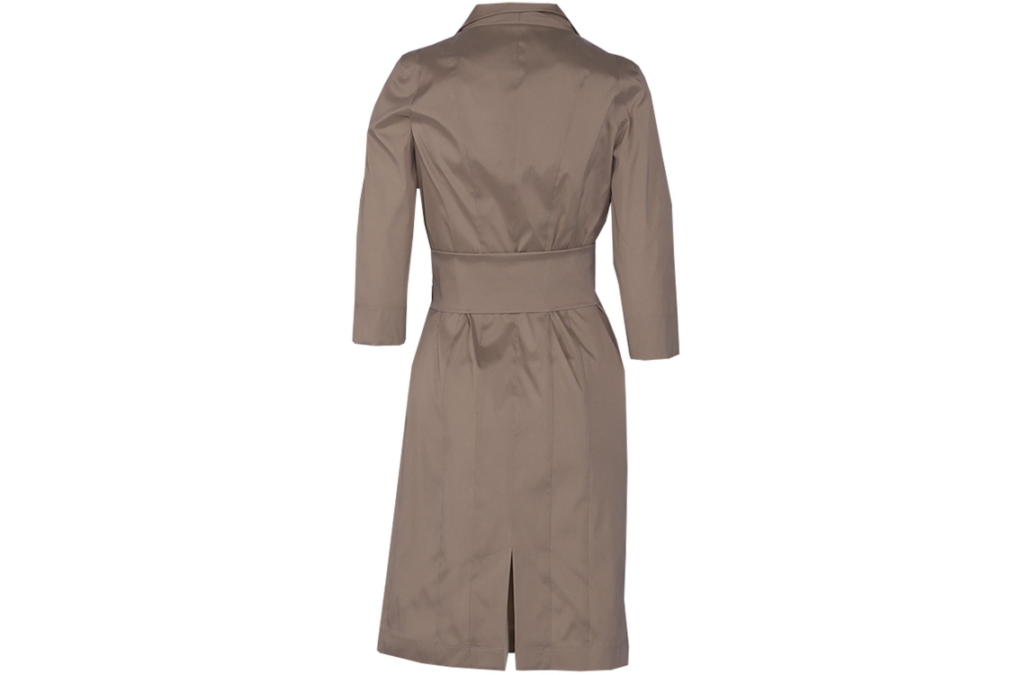 MOQ jurk Sybil2. Dit rechtvallend model is voorzien van een v-hals en heeft driekwart mouwen. Deze zand kleurige jurk van MOQ heeft een opstaande kraag, steekzakken, knoopsluiting voor en een strikceintuur.