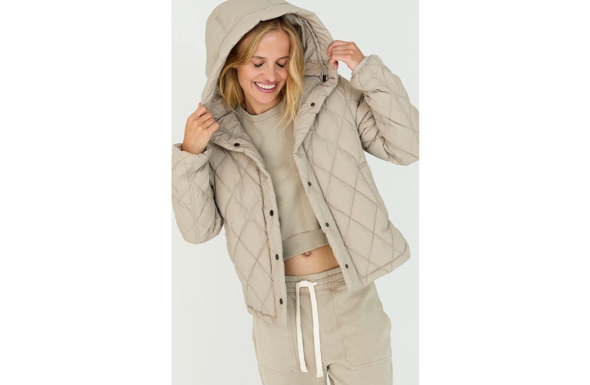 Moscow jas 11-08-Yasmin. Dit rechtvallend model is voorzien van een capuchon met trekkoorden en heeft lange mouwen. Deze zandkleurige jas van Moscow sluit door middel van drukknopen en beschikt over twee steekzakken. Dit model is gewatteerd uitgevoerd in eene ruitstructuur.