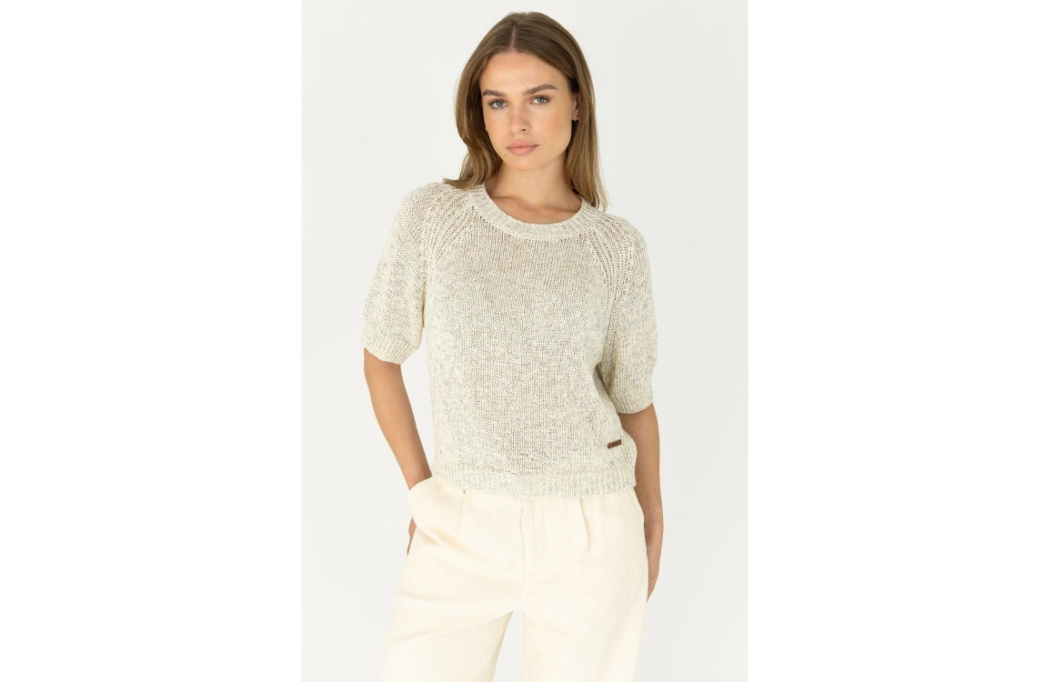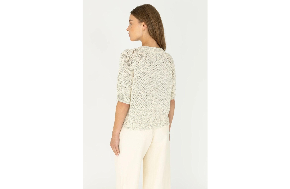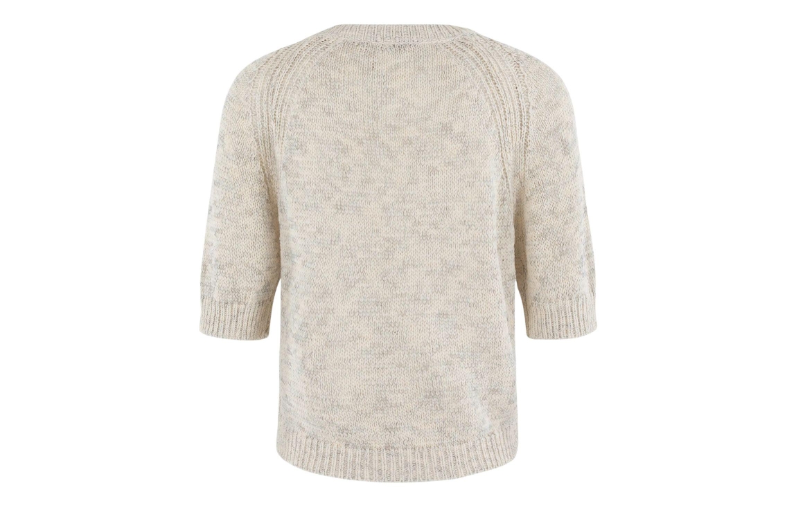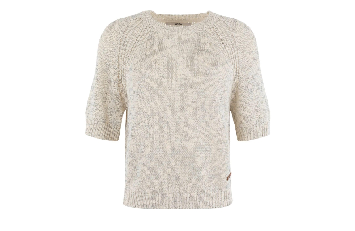 Moscow 24-09-Franca 360-1Flex solid. Dit rechtvallende model heeft een ronde hals en korte mouwen. Deze beige pullover van Moscow is afgewerkt met subtiele ribboorden aan de hals, mouwen en zoom.