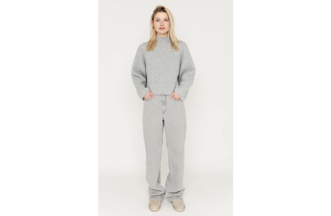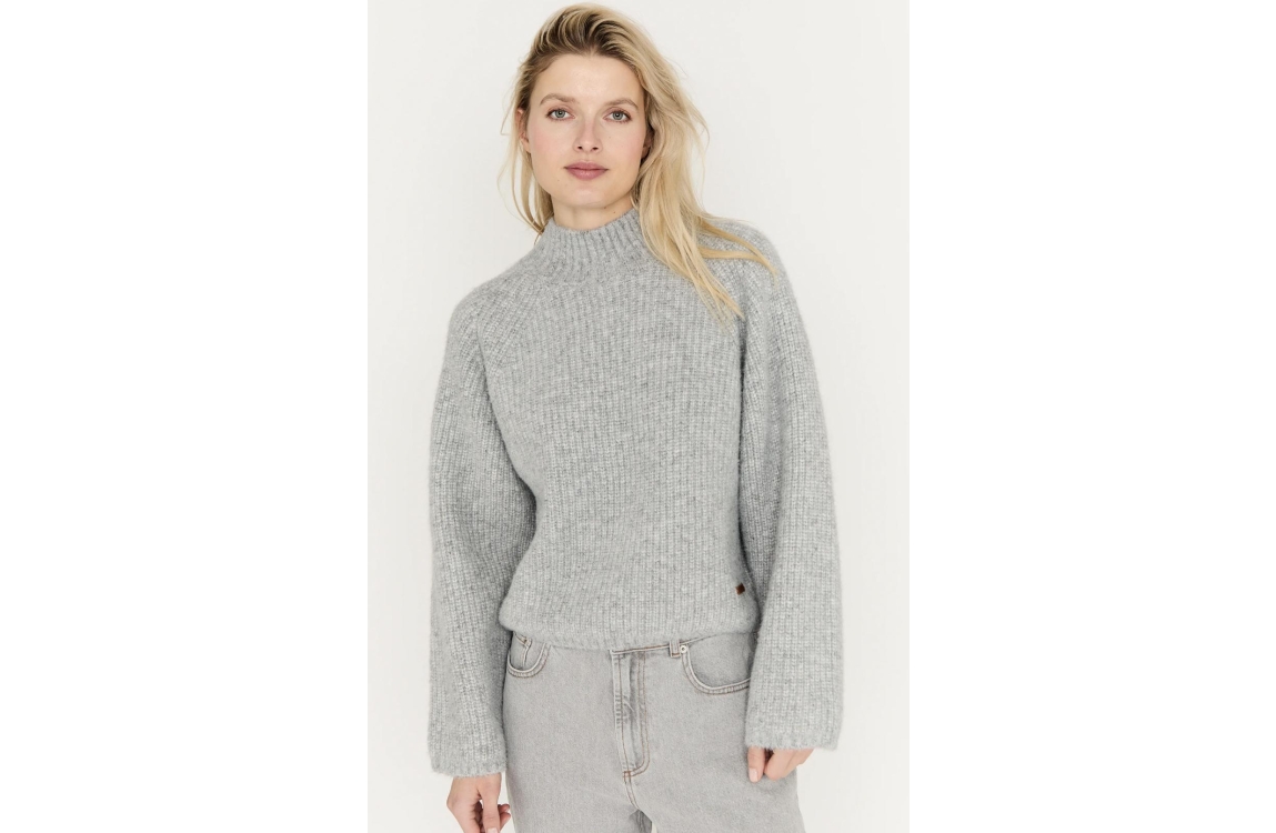 Moscow trui 35-09-Fantasy. Dit rechtvallend model is voorzien van een col en heeft lange mouwen. Deze grijze Moscow trui beschikt over een rib stof.