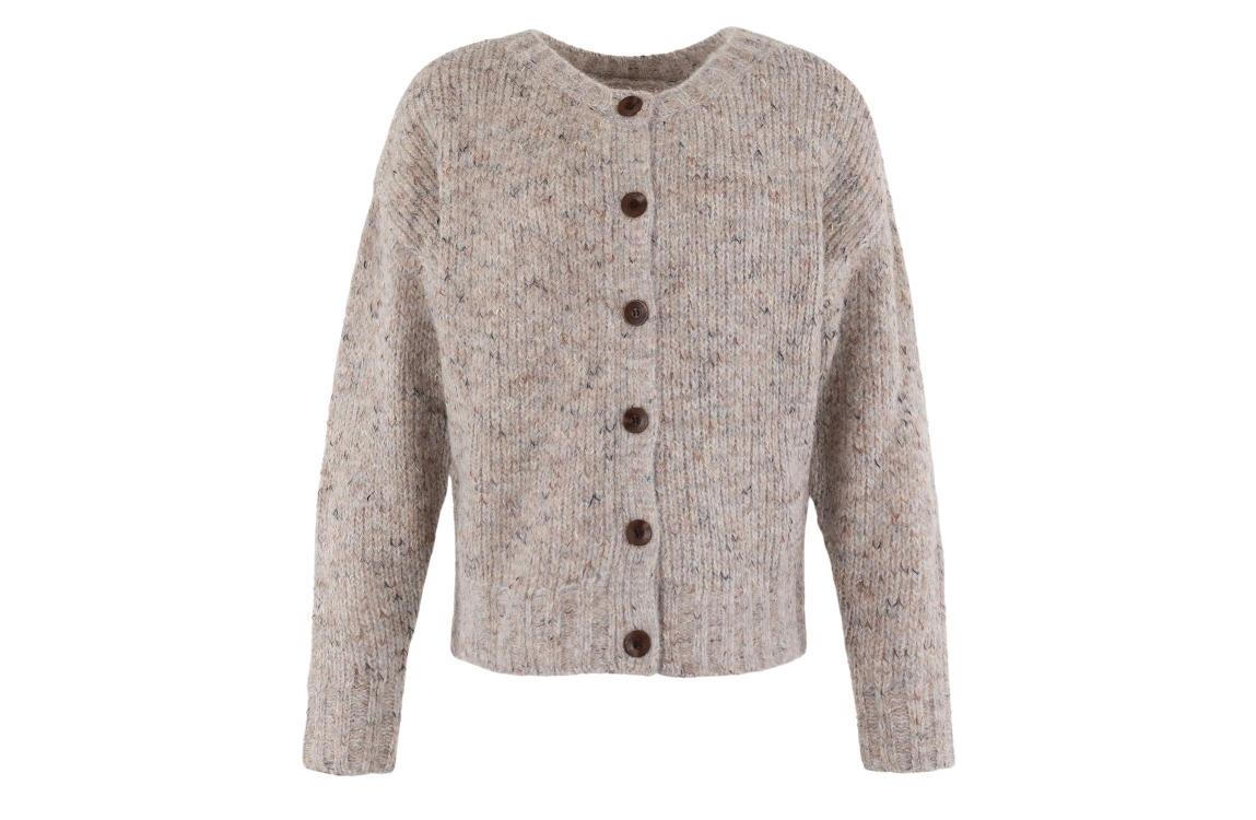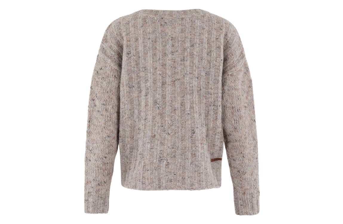 Moscow 49-10-Care 460-2 Taupe dessin. Dit rechtvallende model heeft een ronde hals en lange mouwen. Dit taupekleurige vest van Moscow sluit door middel van houten knopen en is afgewerkt met ribboorden.