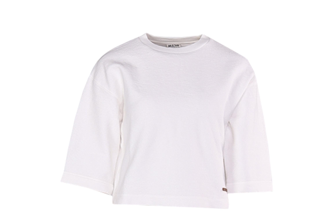 Moscow sweater 76A-04 Jos 310-01. Dit boxy fit model heeft een ronde, ribgebreide halslijn en driekwart mouwen. Deze off-white sweater van Moscow is aan één zijkant voorzien van een rits met het merkembleem en is gemaakt van katoen.