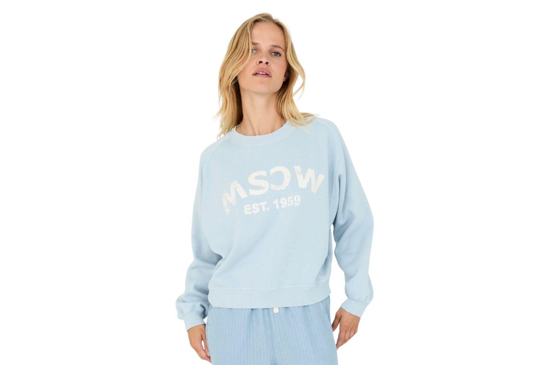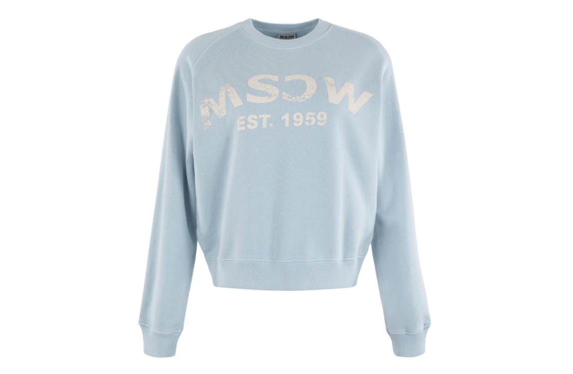 Moscow sweater 76A-04-Pepper 270-1. Dit regular fit model heeft een ronde halslijn en lange mouwen. Deze lichtblauwe sweater van Moscow is op het voorpand bewerkt met het logo en is afgewerkt met ribgebreide boorden.