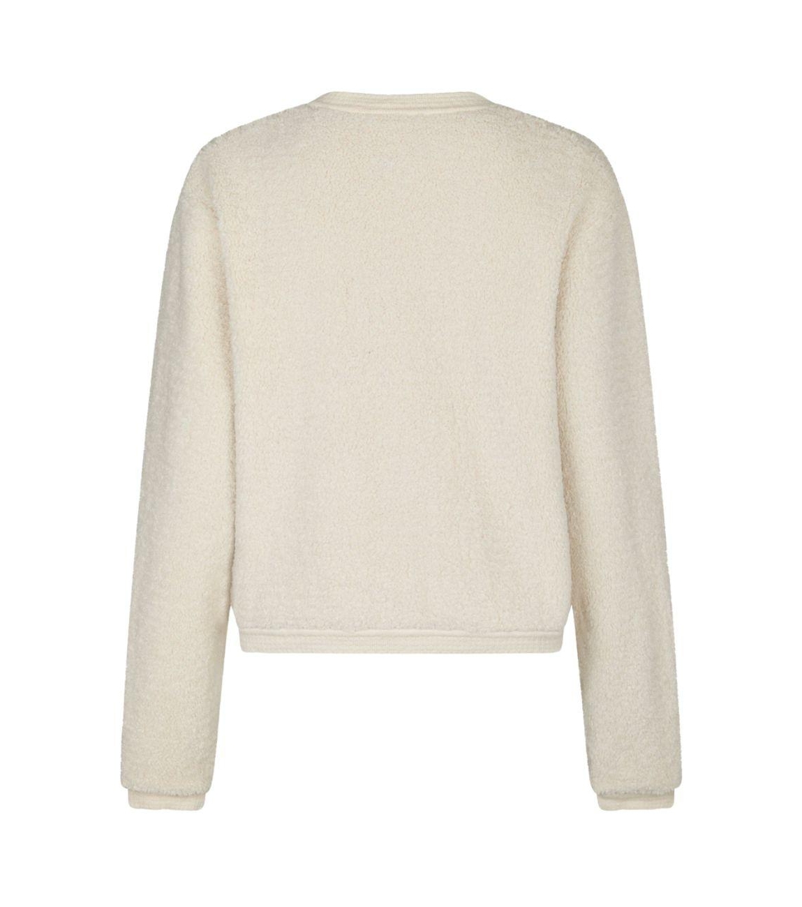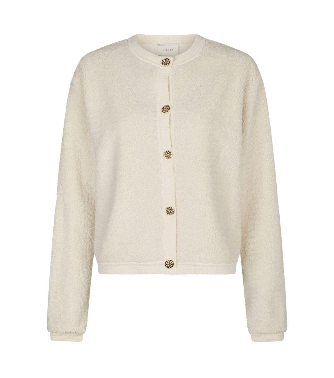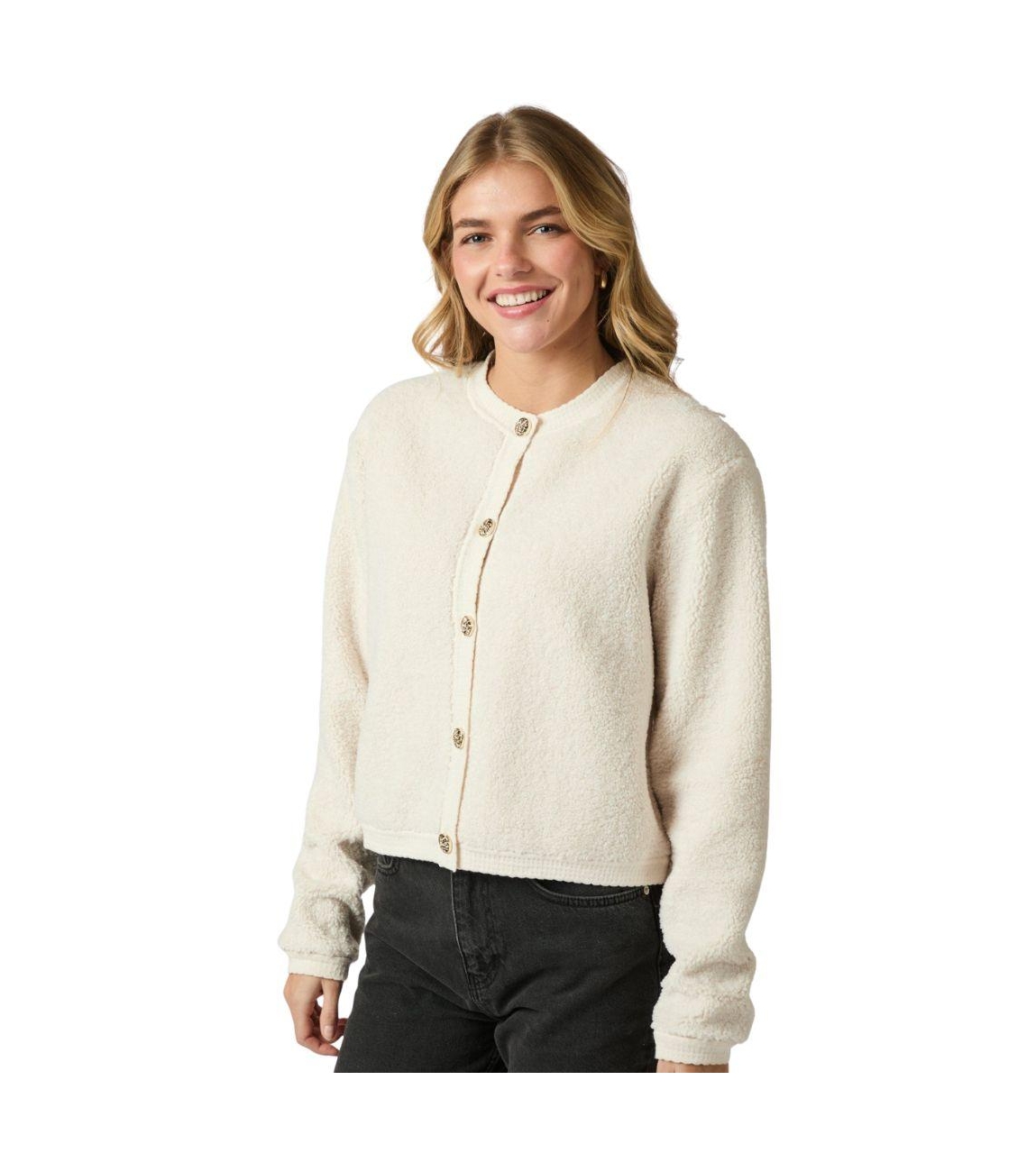 Neo Noir cardigan 161963. Dit rechtvallende model heeft een ronde halslijn en lange mouwen. Deze cremekleurige cardigan sluit aan de voorzijde door middel van gedetailleerde, goudkleurige knopen en is uitgevoerd in fluffy knit kwaliteit. Het model is afgewerkt met effen boorden.