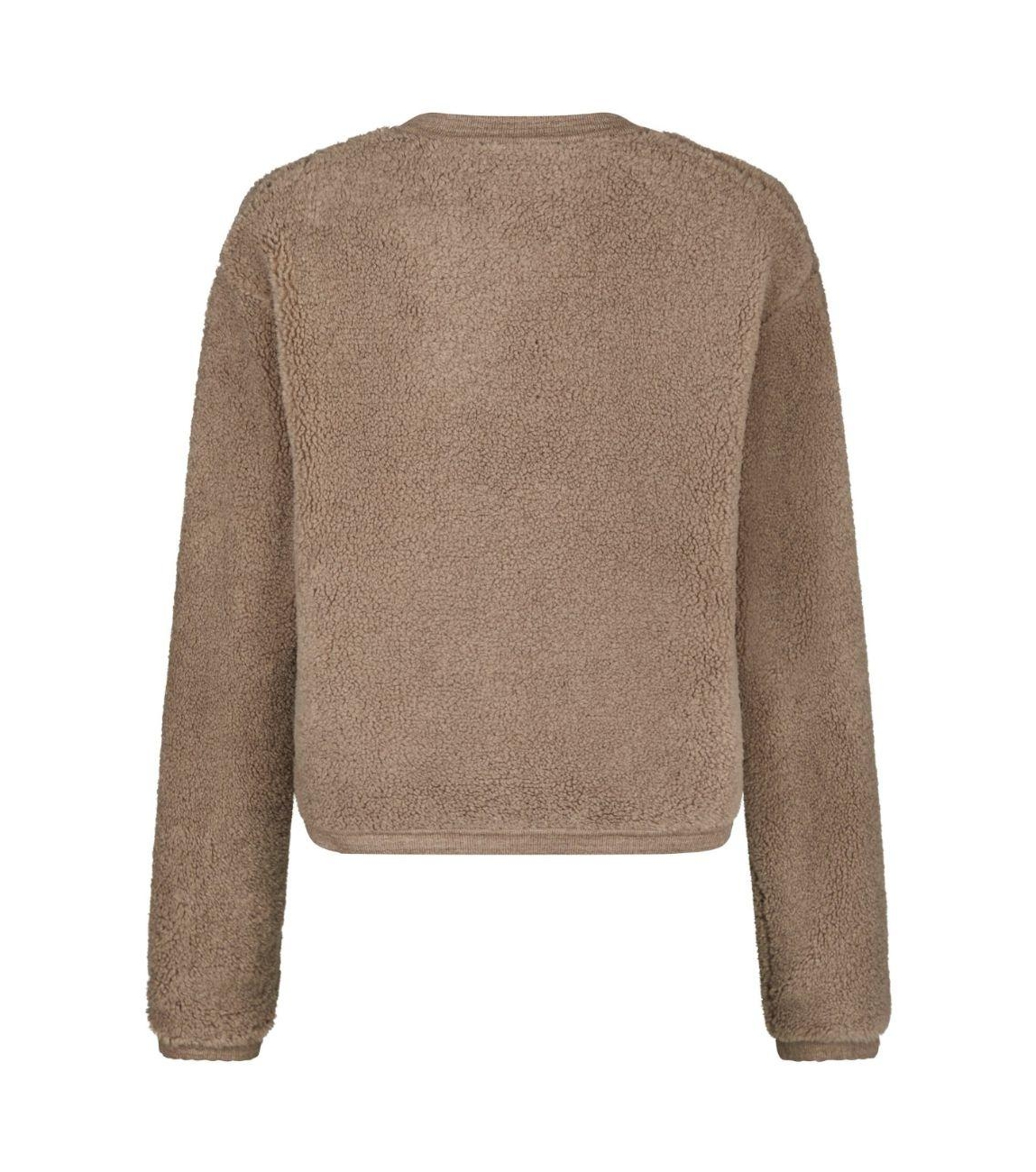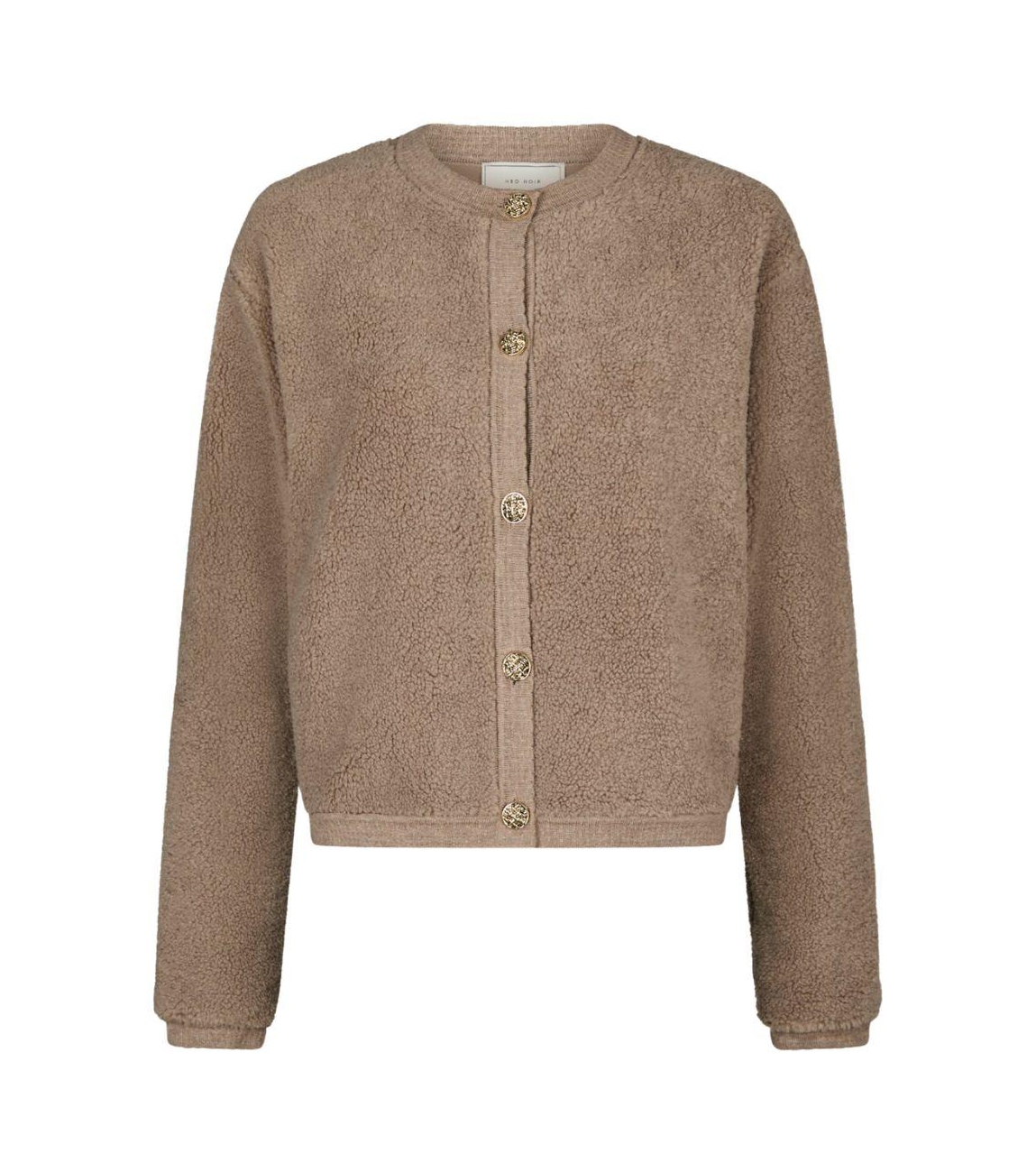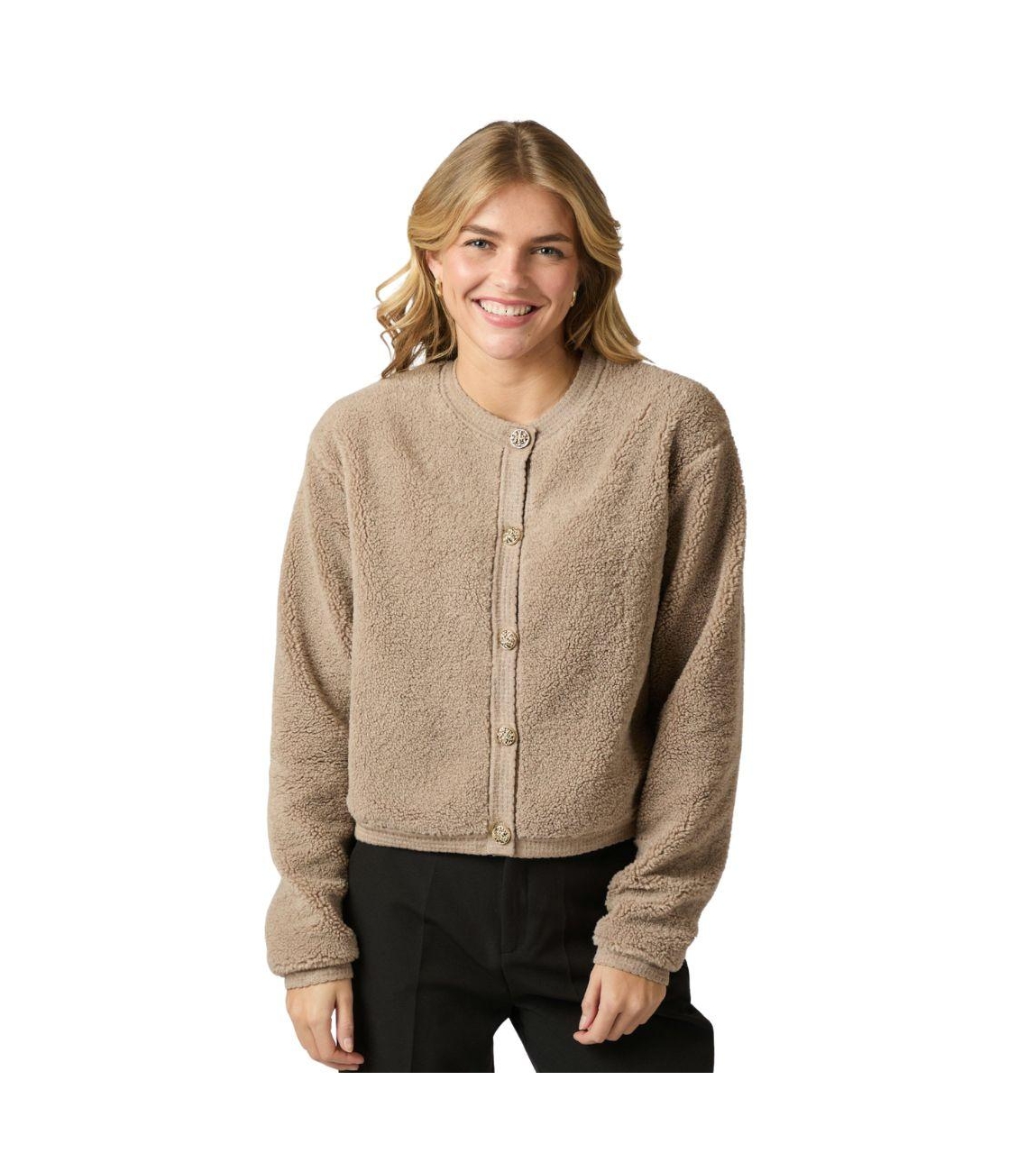 Neo Noir cardigan 161963. Dit rechtvallende model heeft een ronde halslijn en lange mouwen. Deze bruine cardigan sluit aan de voorzijde door middel van gedetailleerde, goudkleurige knopen en is uitgevoerd in fluffy knit kwaliteit. Het model is afgewerkt met effen boorden.