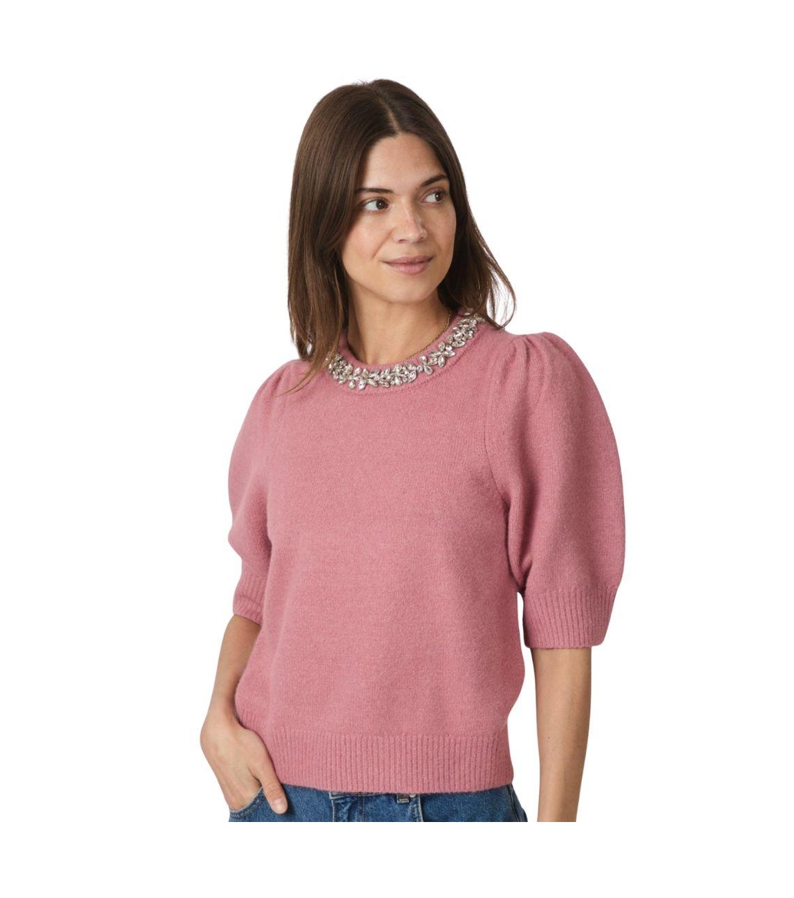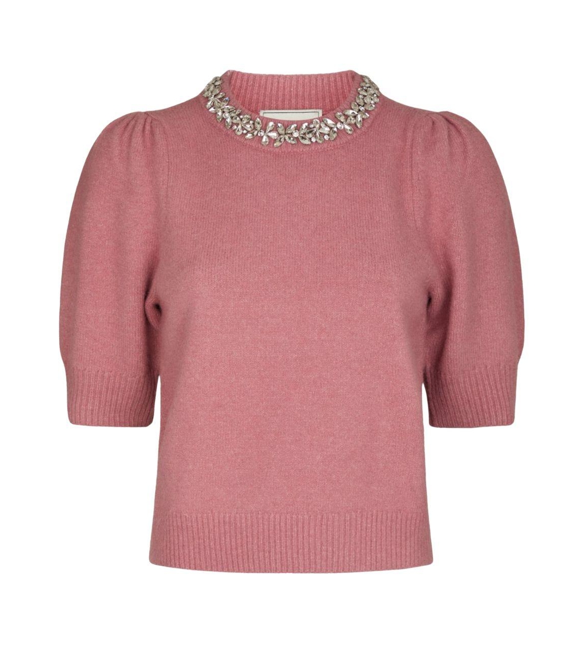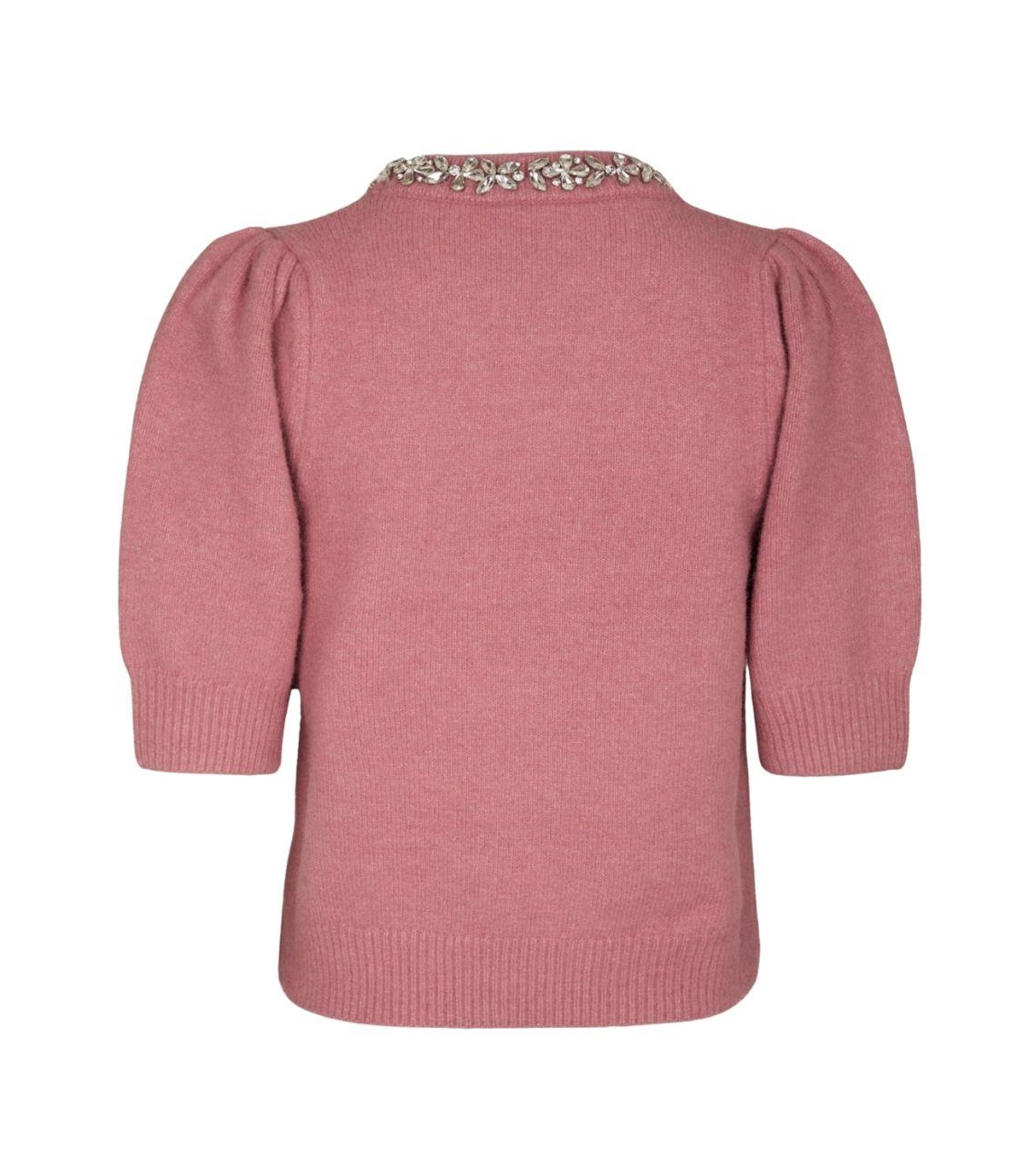 Neo Noir trui Maia 162914 165. Dit rechtvallende model heeft een ronde halslijn en middellange ballonmouwen. Deze roze trui van Neo Noir is op de hals gedetailleerd met steentjes en ribgebreide boorden.