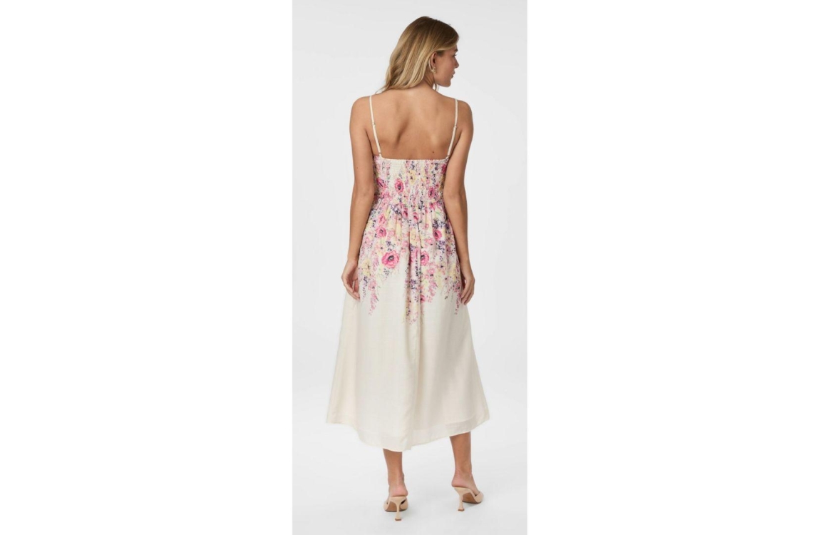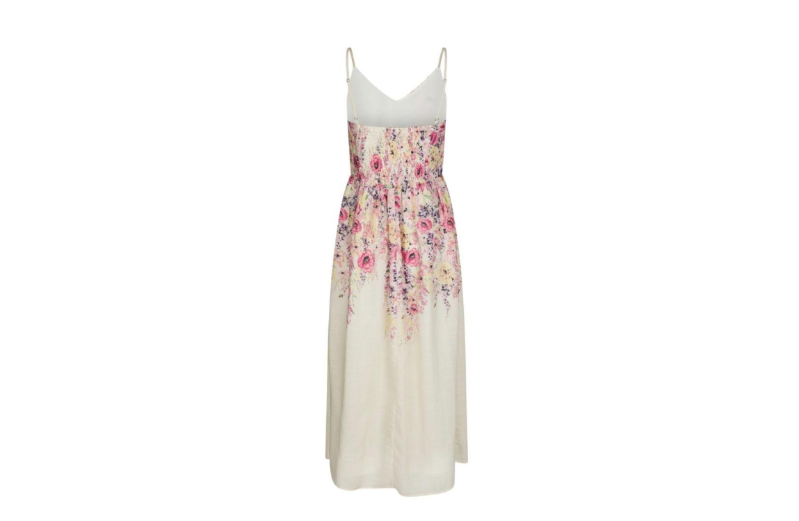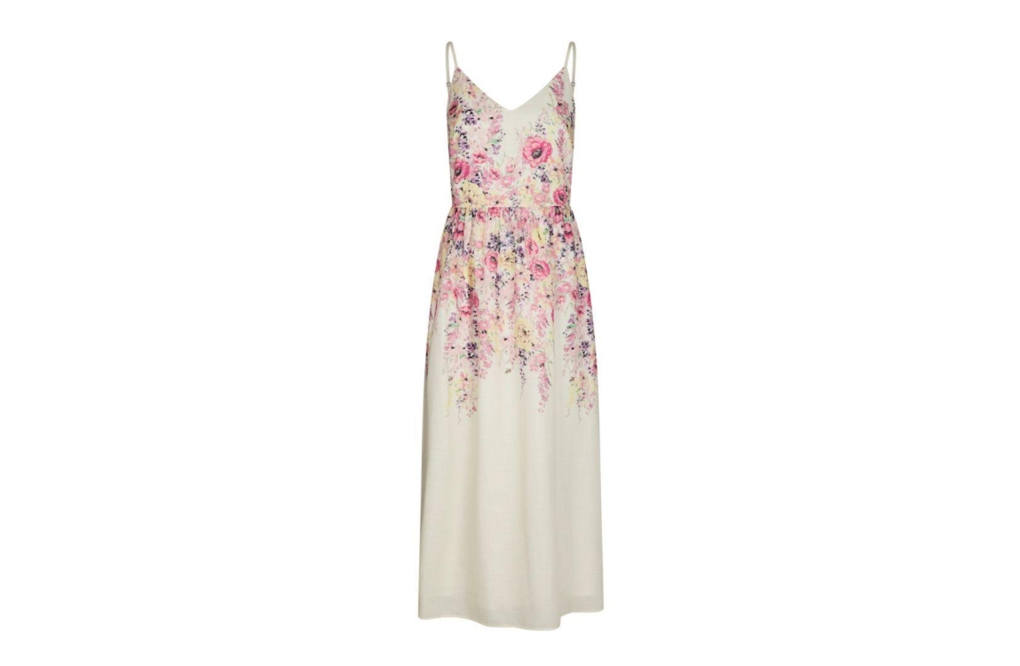 Neo Noir jurk 166178. Dit rechtvallend model is voorzien van een v-hals en heeft verstelbare spaghettibandjes. Deze beige jurk van Neo Noir sluit aan de zijkant door middel van een blinde rits en is gedeeltelijk bewerkt met een bloemenprint. Dit model is aan de achterzijde afgewerkt met smockdetail en beschikt over een voering aan de binnenzijde.