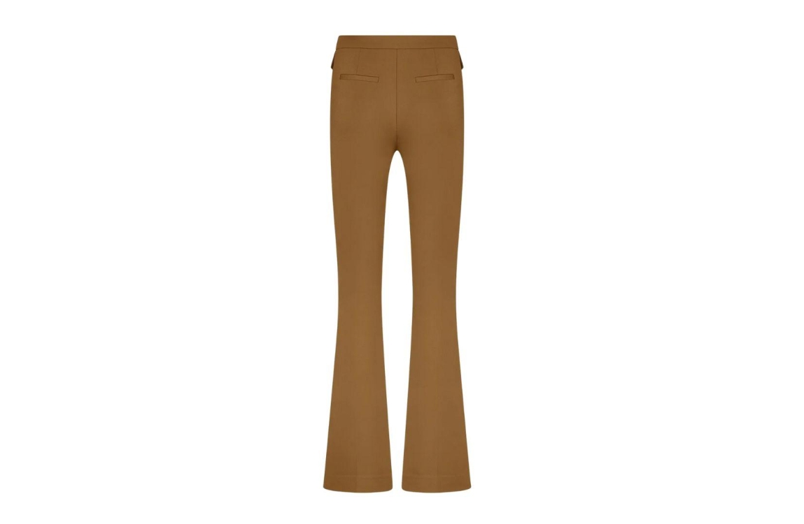 Nikkie pantalon Lancastero N2-502 2505. Dit flared model sluit door middel van een blinde rits- en knoopsluiting. Deze toffeekleurig pantalon van Nikkie beschikt aan de voorzijde van twee klepzakken met logo knopen en aan de achterzijde van twee paspelzakken.
