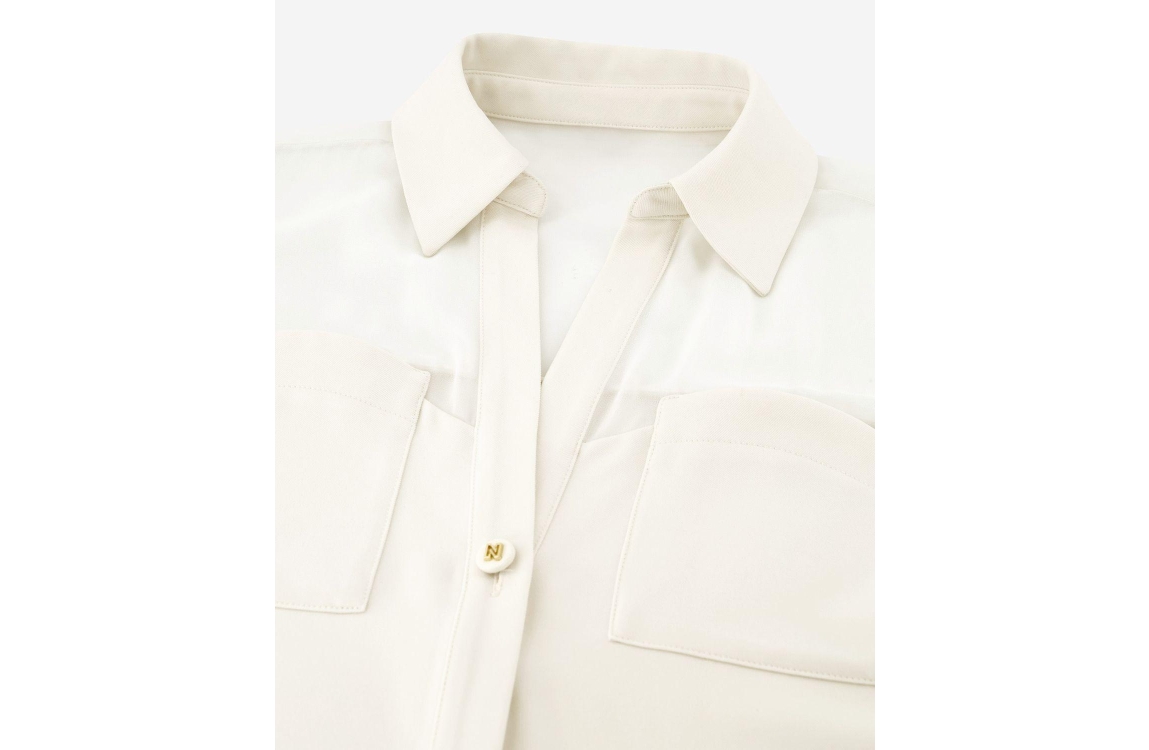 Nikkie Larisa Blouse 2001 Cream. Dit rechtvallende model is voorzien van een v-hals en heeft lange mouwen afgewerkt met een logo knoop. Deze off-white blouse van Nikkie sluit door middel van knopen. Dit model is bewerkt met twee borstzakken.