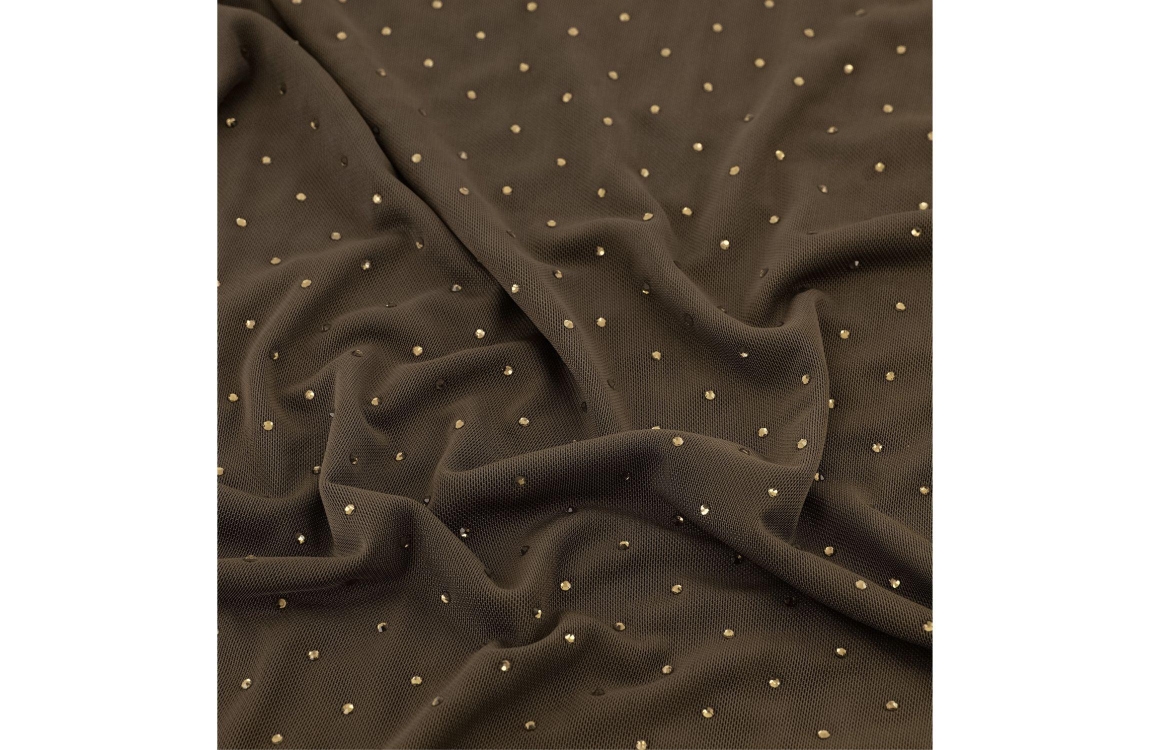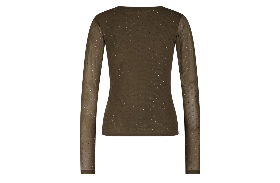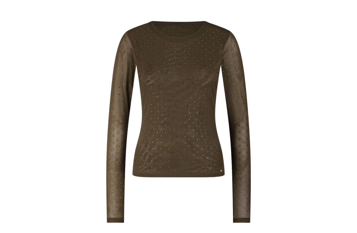 Nikkie Linne Gold Top 1004 Gold. Dit aangesloten model is voorzien van een ronde hals en heeft lange mouwen. Deze bruine mesh top van Nikkie is all-over bewerkt met gouden glitter studs.
