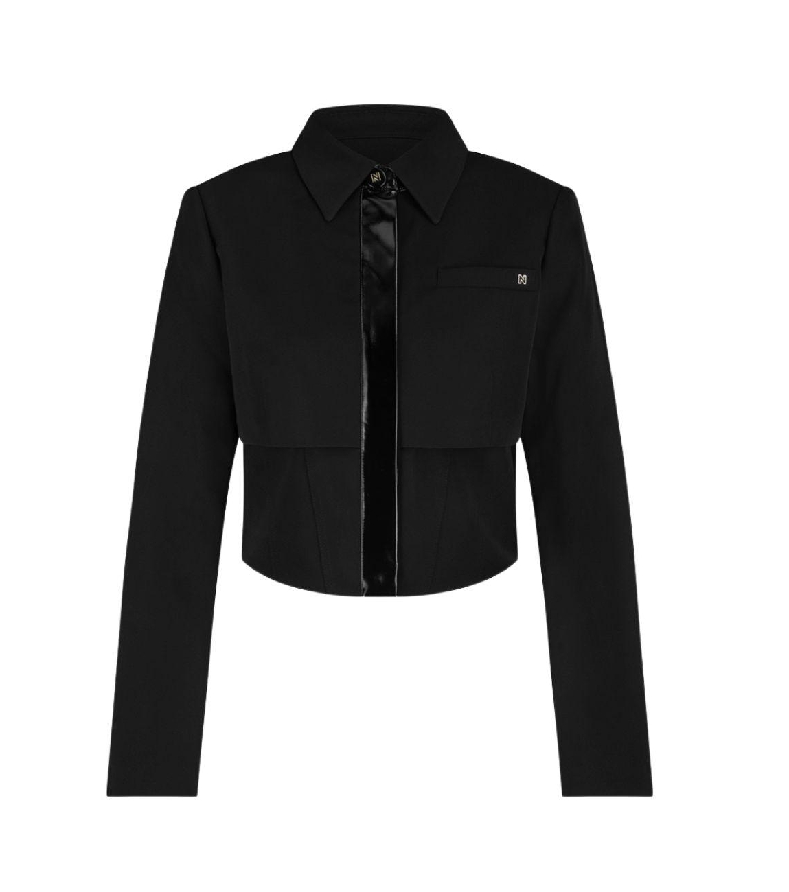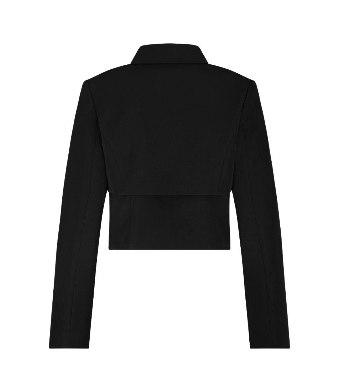 Nikkie blazer Louisville N 1-524 2505. Dit cropped-model heeft een kraag en lange mouwen. Deze zwarte blazer van Nikkie sluit aan de voorzijde met een rits- en knoopsluiting en is bewerkt met een imitatieleren detail langs de rits en halslijn. Het model is voorzien van een decoratief borstzakje met het merkembleem.