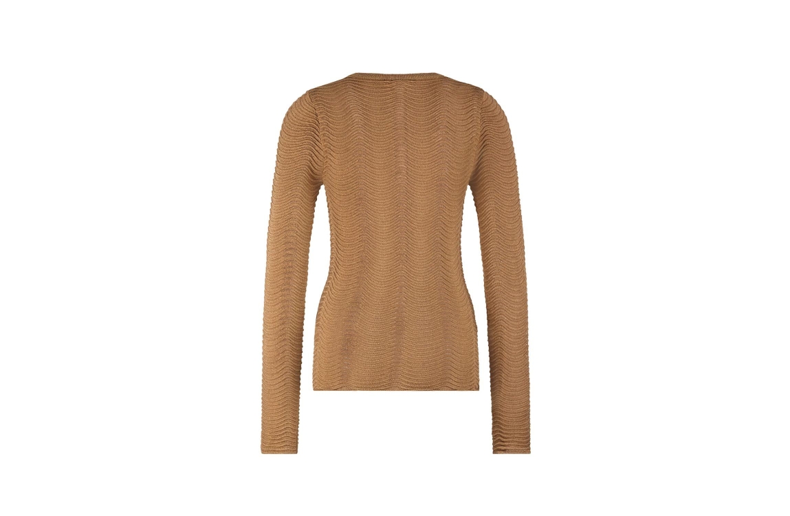 Nikkie Lucena Top 5505 Toffee. Dit aangesloten model is voorzien van een ronde hals en heeft lange mouwen. Deze camel kleurige geribde top van Nikkie is all-over bewerkt met een subtiel glitterdraad.