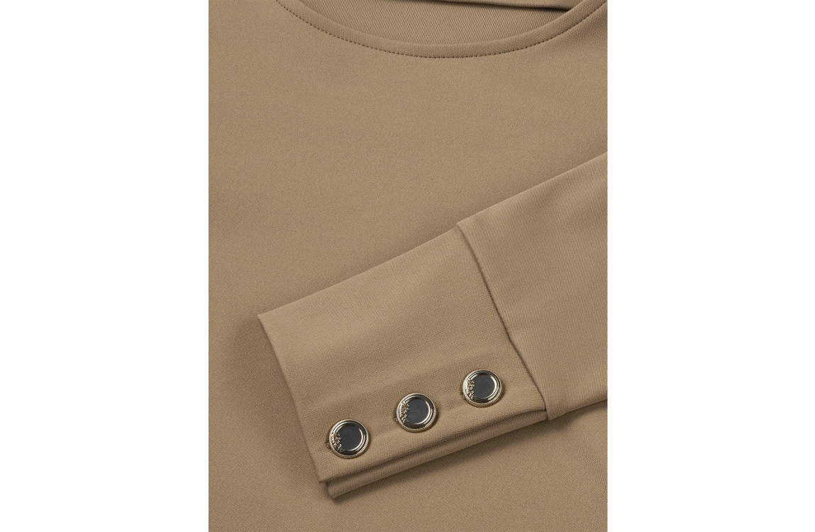 NIKKIE top Oshawa 5506. Dit aangesloten model is voorzien van een ronde hals en heeft lange mouwen. Deze bruine top van NIKKIE is uitgevoerd in een elastische stof.