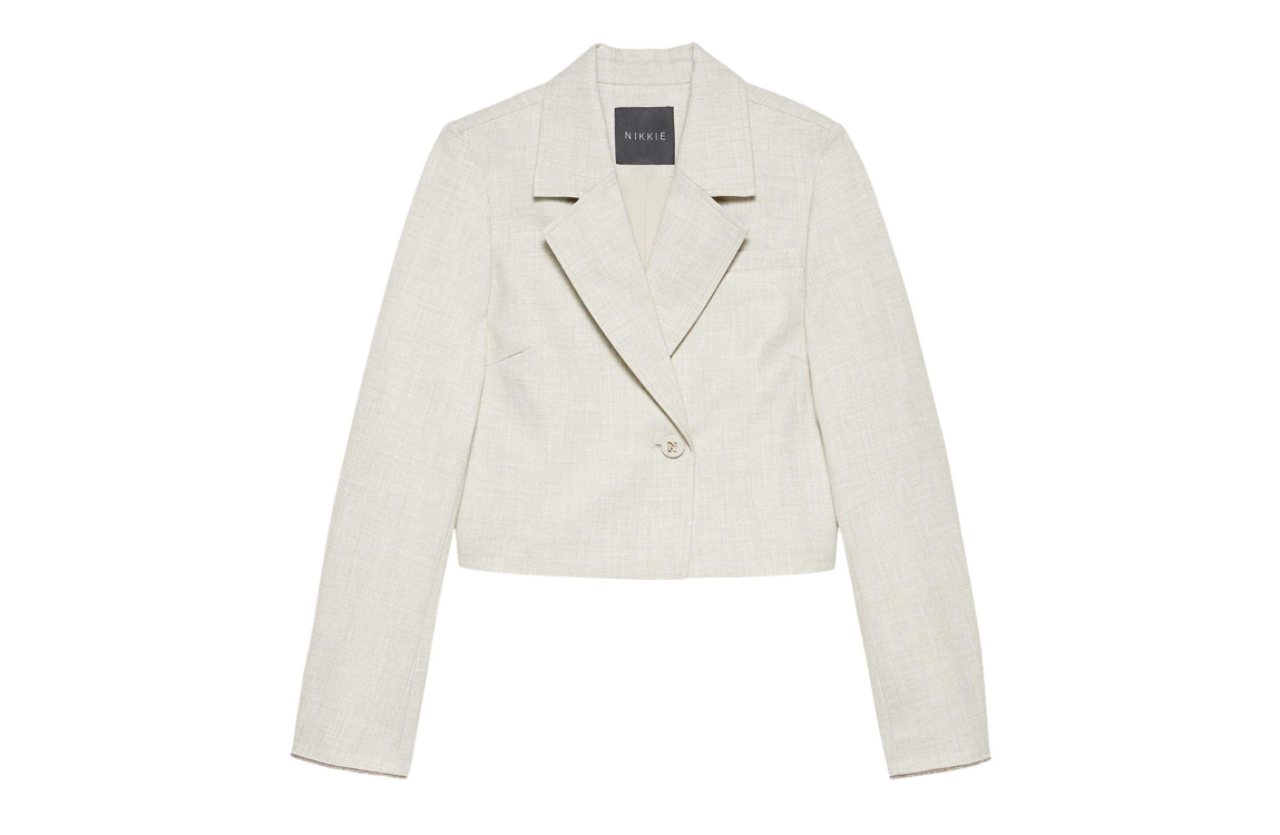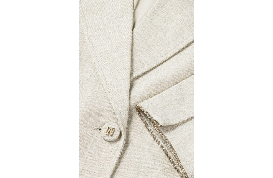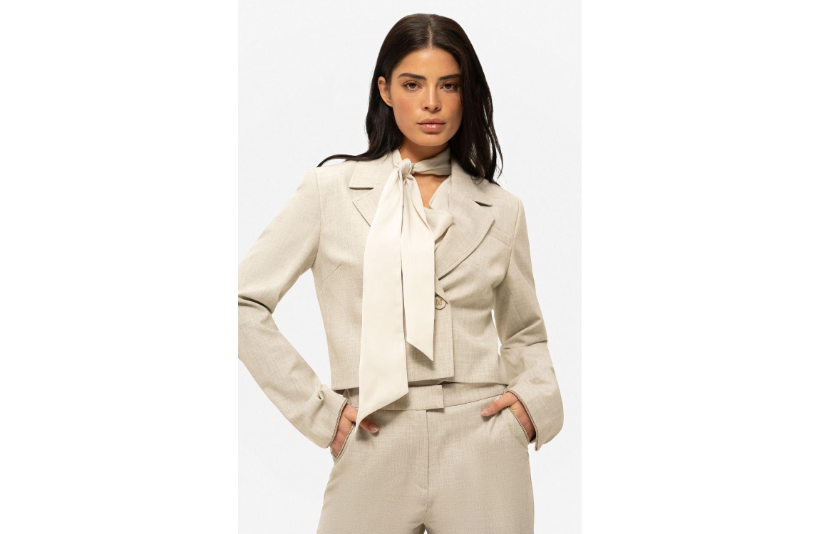 Nikkie Pateete Blazer 2001 Cream. Dit cropped-model heeft een kraag en lange mouwen. Deze beige/grijze blazer van Nikkie sluit aan de voorzijde met een knoopsluiting, Het model is voorzien van een subtiel glitter boord aan de onderzijde van de mouwen.