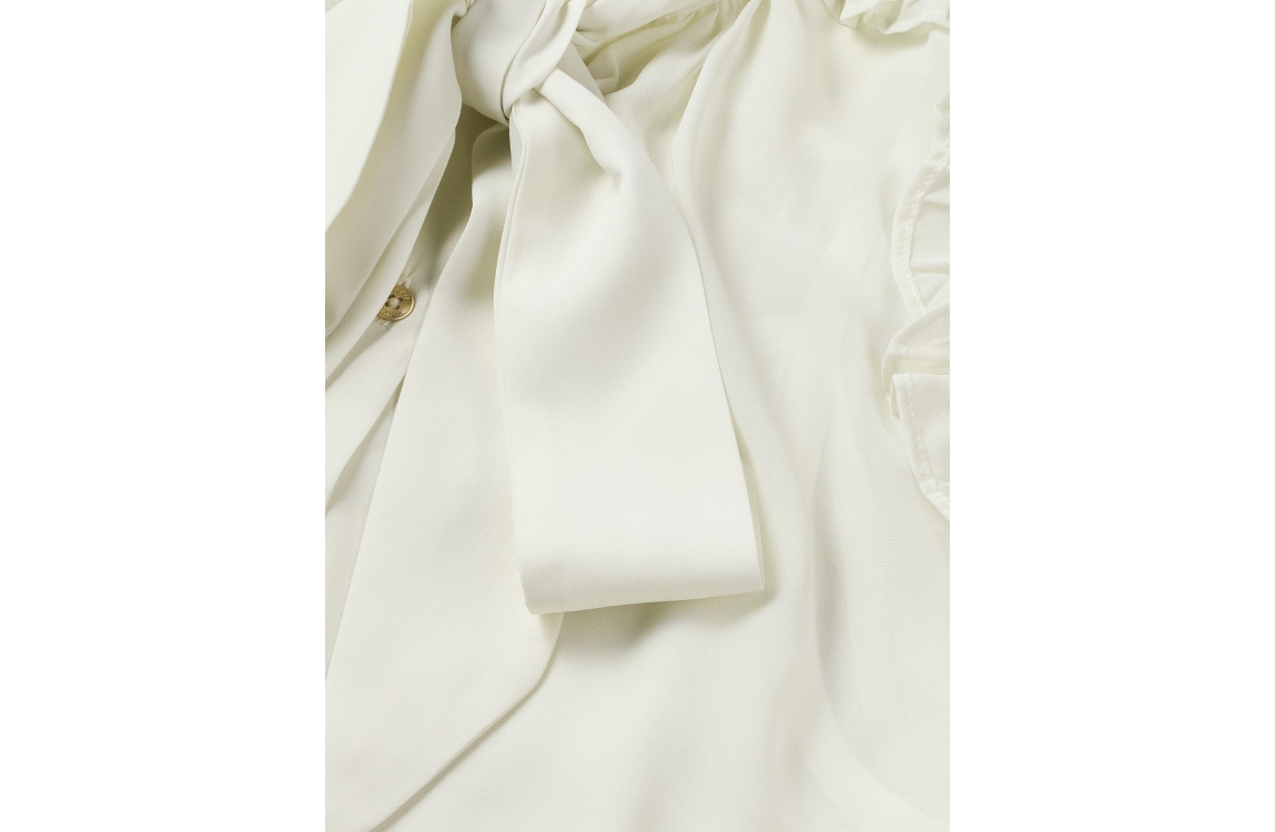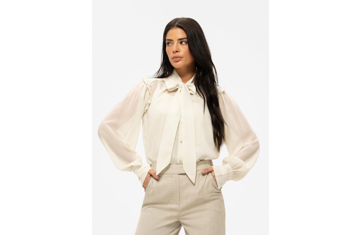 Nikkie Pragues Blouse 2522 N 6-209 2602. Dit soepelvallend model heeft een ronde hals met strik detail, lange mouwen en sluit door middel van knopen. Deze beige blouse van Nikkie is voorzien van roezels en uitgevoerd in een semi-transparant materiaal. Dit model beschikt over een ondershirt.