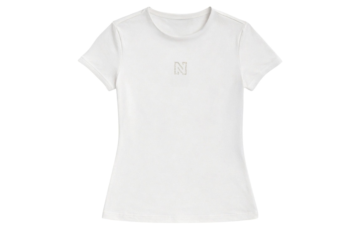 Nikkie Swarovski N Top 1027 Star White. Dit aangesloten model is voorzien van een ronde hals en heeft korte mouwen. Deze witte top van Nikkie is afgewerkt met een N-logo van Swarovski steentjes. Dit model is gemaakt van een zachte stretch stof.
