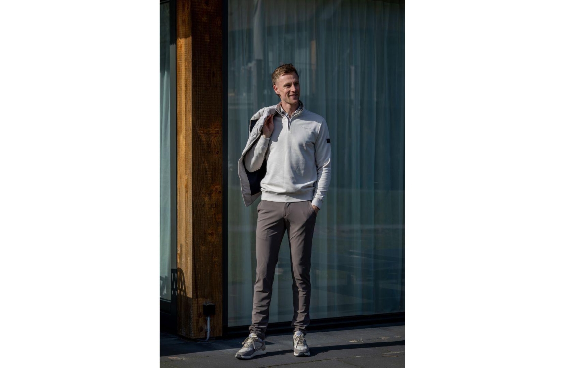 NORTH84 Sensitive Travel pantalon 245. Dit slim fit model sluit door middel van een knoop, rits en beige trekkoord. Deze taupe broek van NORTH84 beschikt over twee steekzakken aan de voorzijde en twee paspelzakken aan de achterzijde. Dit model is voorzien van ceintuurlussen en is uitgevoerd in travel kwaliteit. De knoop en het trekkoord zijn lichter van kleur dan de rest van de pantalon.