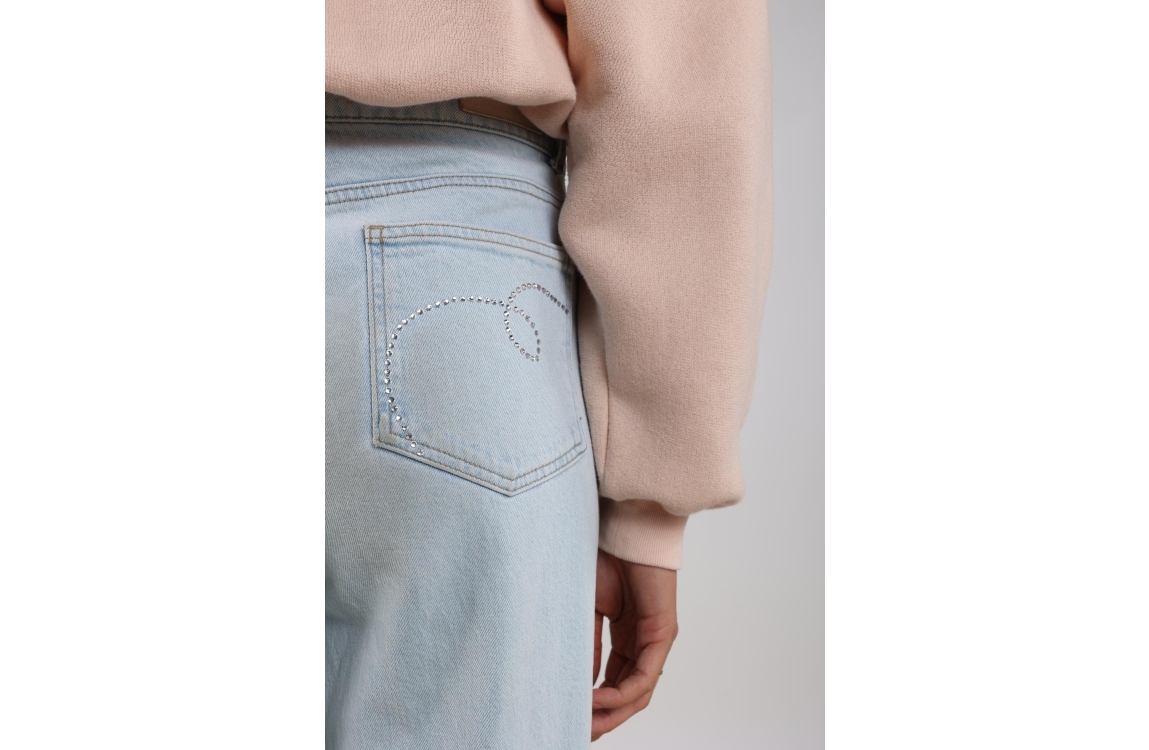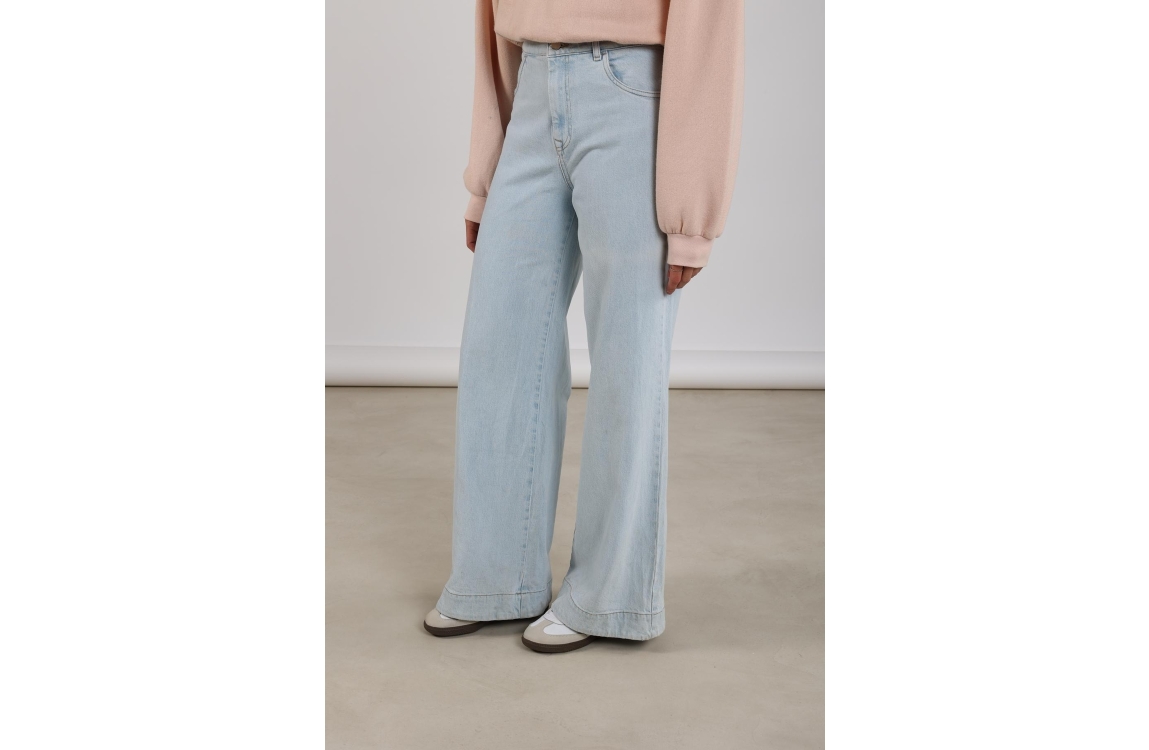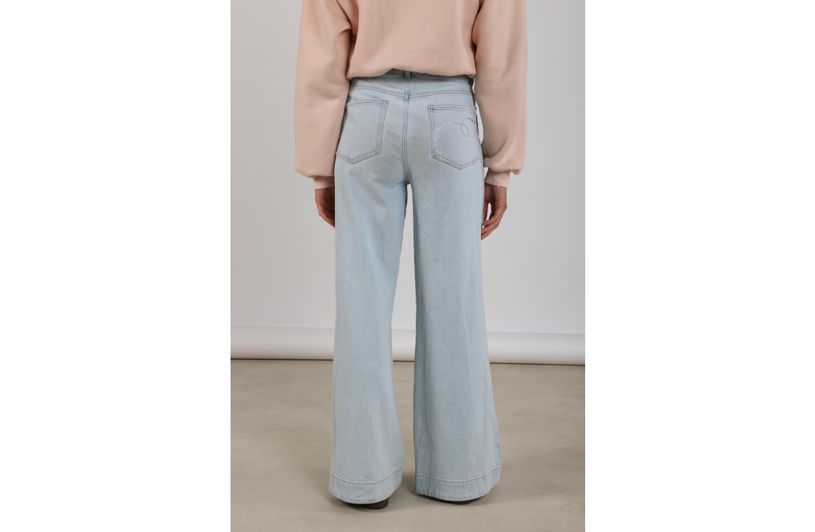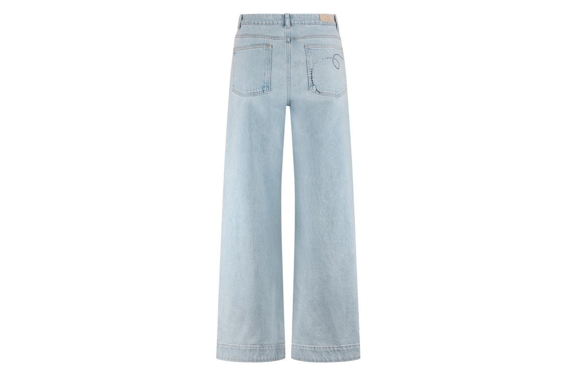 NUKUS Abby Pants Denim Strass 24 bleached denim. Dit wide leg model sluit door middel van een knoop en rits afgewerkt met ceintuurlussen. Deze licht blauwe jeans van Nukus is uitgevoerd met een opvallend detail: een glitterdesign op de achterzak voor een subtiele sparkle.