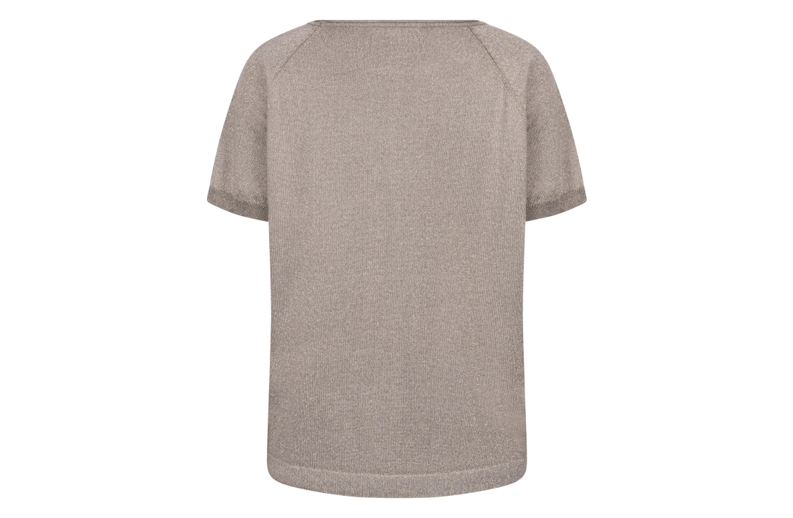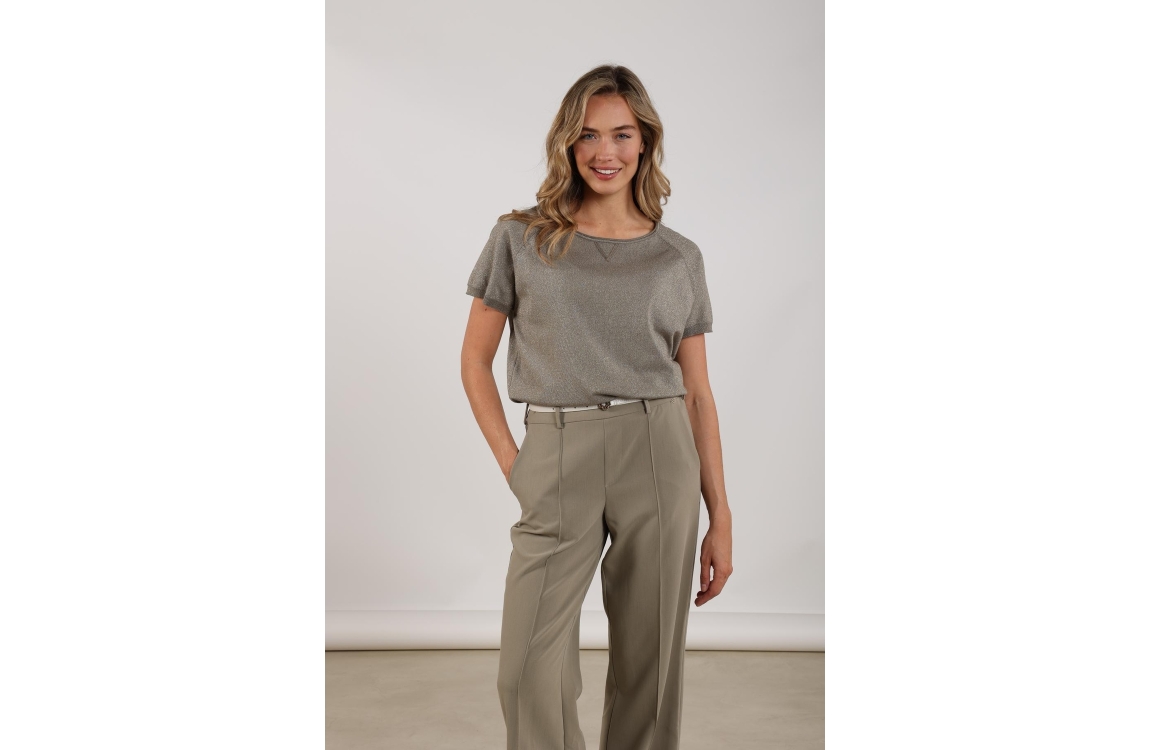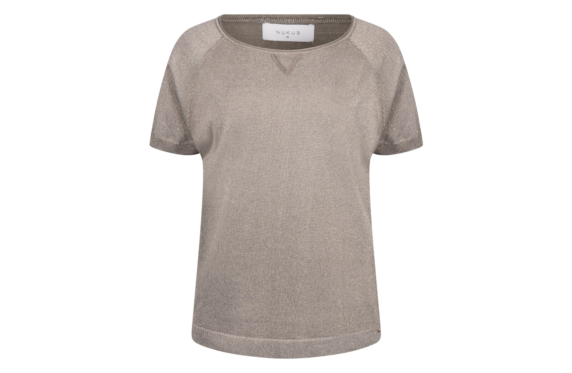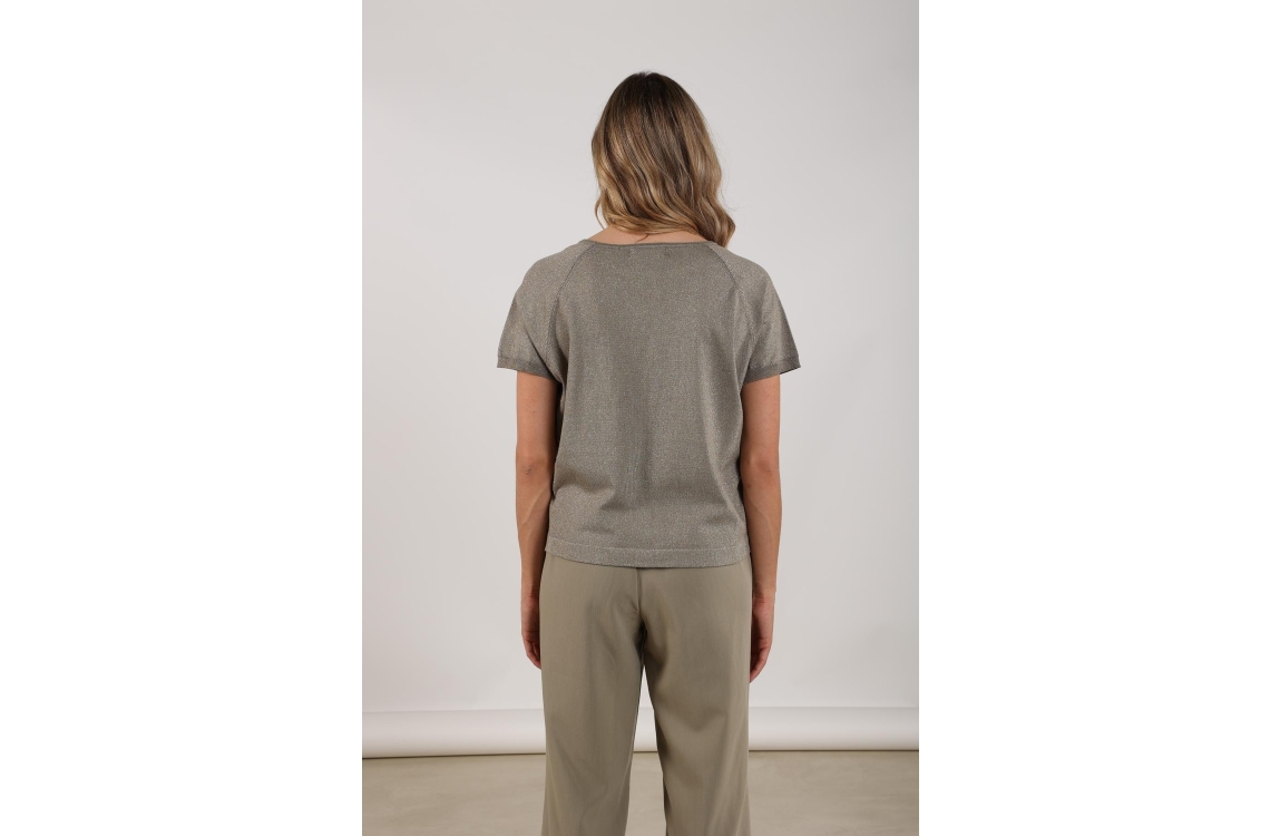 NUKUS Anita Top Lurex 350 army. Dit rechtvallende model is voorzien van een ronde hals en heeft korte mouwen. Dit groene shirt van Nukus is all-over bewerkt met een lurexdraadje en afgewerkt met boorden.