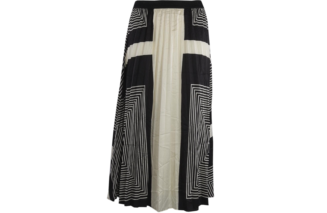 Nukus rok ANNA FW23072. Dit soepelvallend model sluit door middel van een elastische tailleband gedetailleerd met glitter stroken. Deze zwart/witte rok van Nukus is all-over bewerkt met een streepprint.