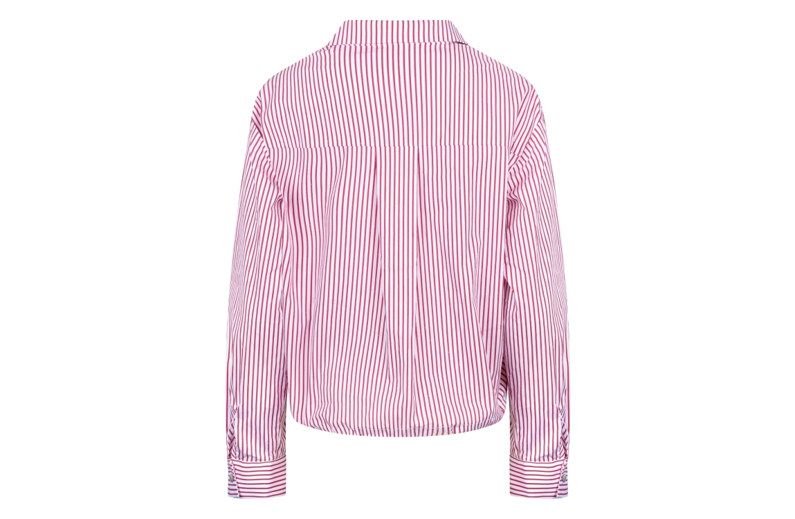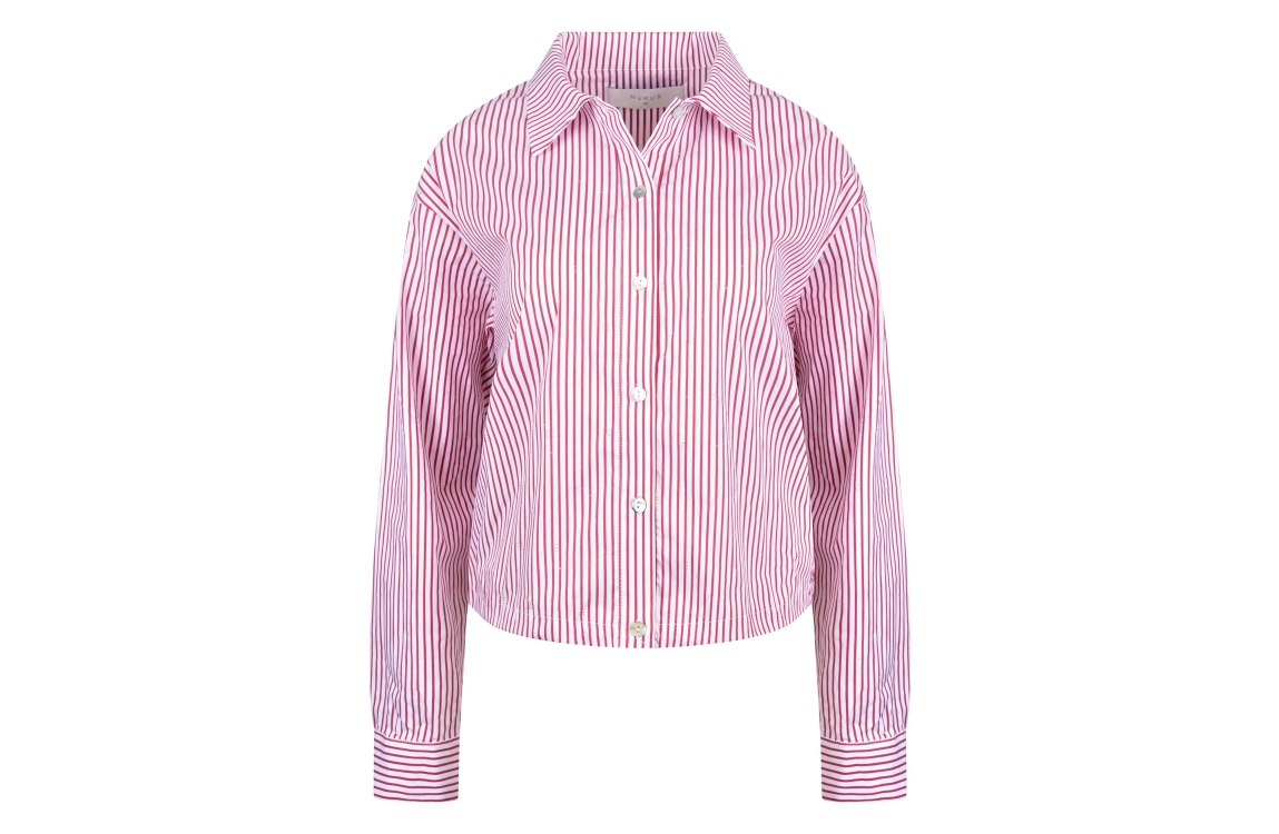 NUKUS Ariana Blouse Stripe 372 kiss/offwhite. Dit rechtvallende model heeft een kraag en lange mouwen. Deze rood-wit gestreepte blouse van NUKUS sluit door middel van knopen.