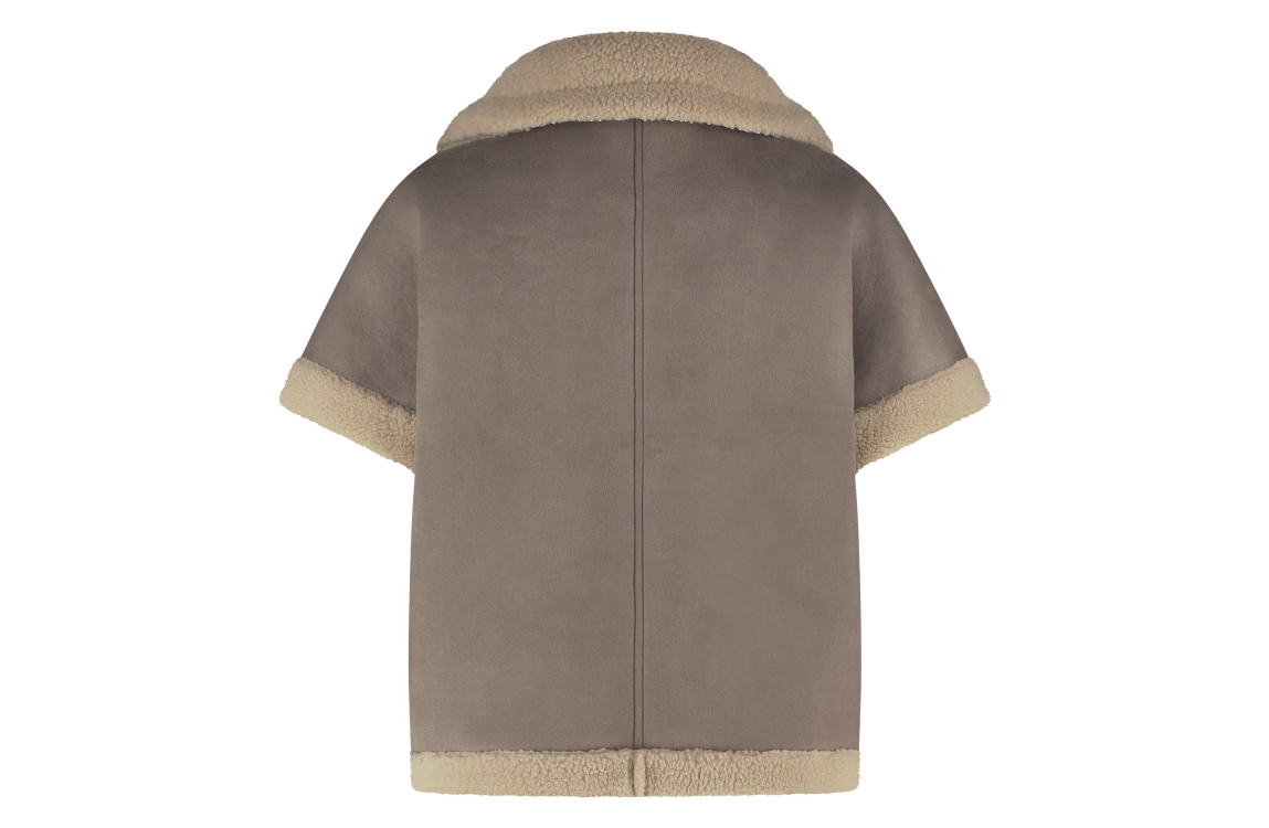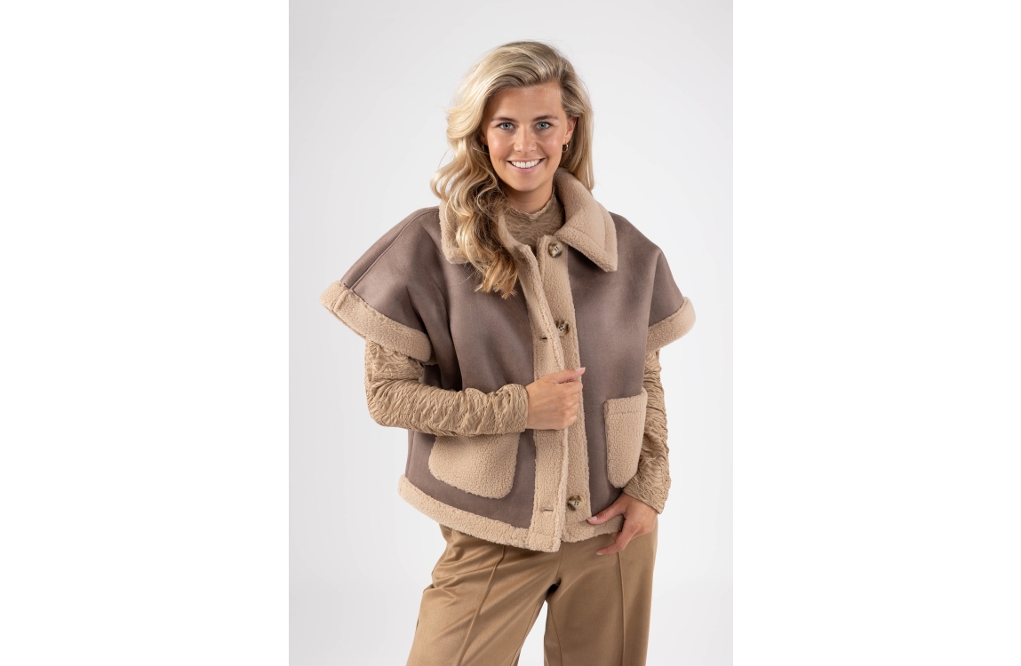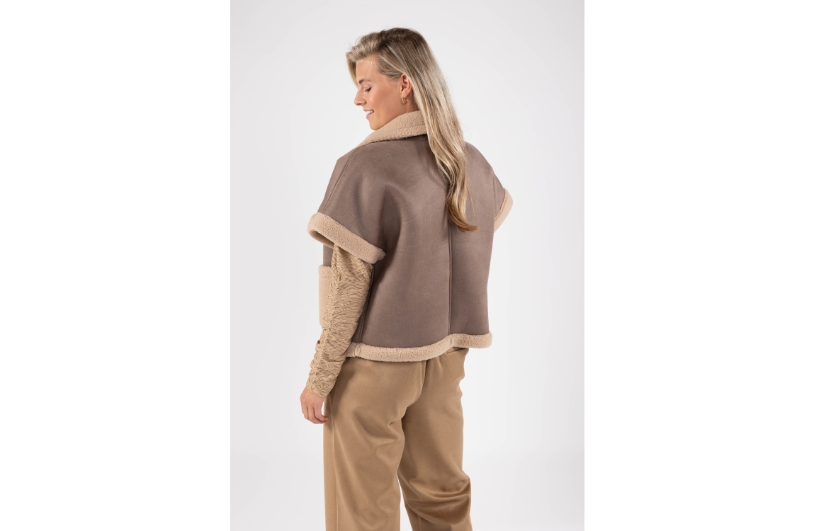 NUKUS gilet Athena FW241834. Dit rechtvallend model heeft een kraag en korte mouwen met hangende schouders. Deze bruine gilet van Nukus sluit aan de voorzijde door middel van knopen en beschikt over twee opgestikte zakken aan de voorzijde. Dit model is uitgevoerd in een leerlook aan de buitenzijde en teddy stof aan de binnenzijde en kraag, zakken en boorden.