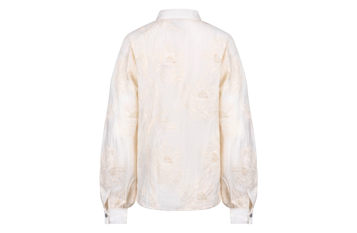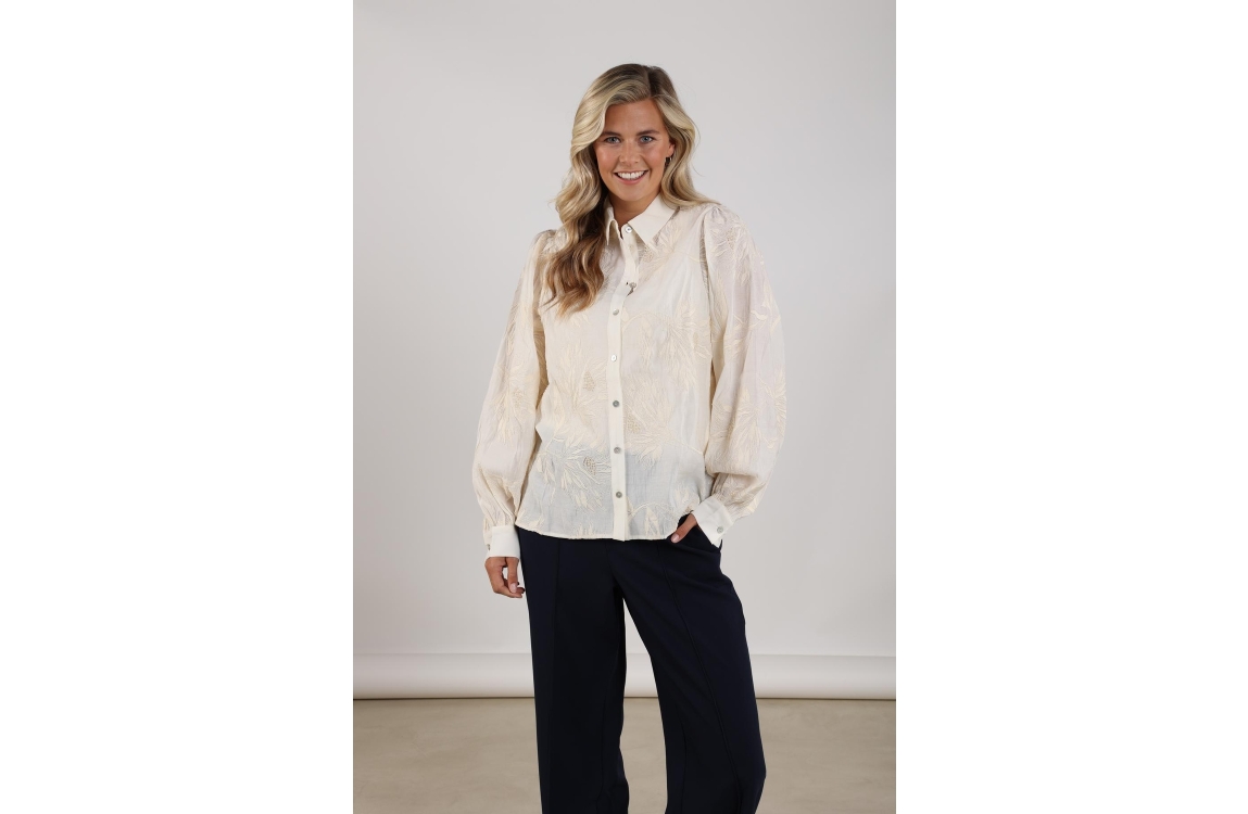 NUKUS Avy Blouse Embroidery 56 off white. Dit rechtvallende model is voorzien van een kraag en heeft lange mouwen. Deze off-white blouse van Nukus sluit door middel van knopen en is all-over bewerkt met borduursels en parels.