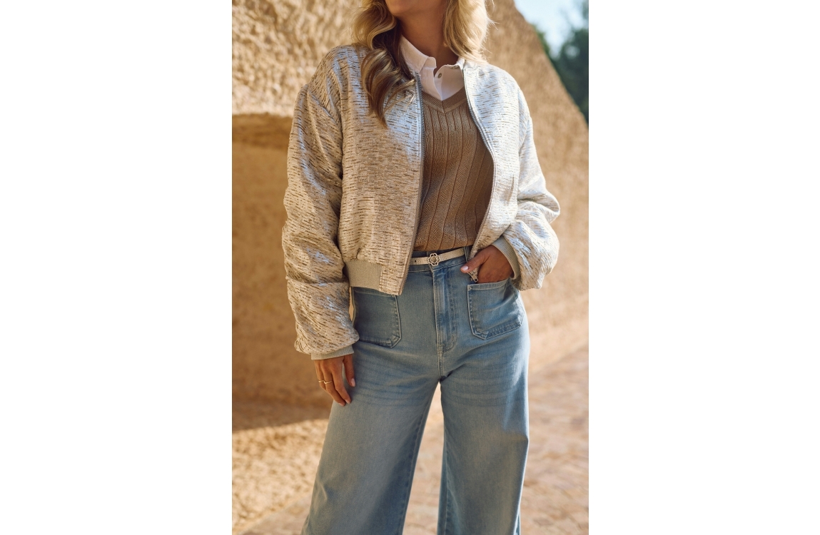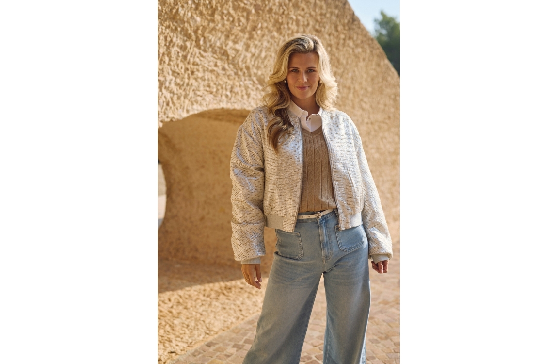 NUKUS Babette Bomber 374 silver/camel. Dit rechtvallende model is voorzien van een ronde hals en heeft lange mouwen. Dit zilver kleurige bomber jasje van Nukus sluit door middel van een rits en is afgewerkt met ribboorden. Dit model is bewerkt met een satijnglans en heeft twee steekzakken aan de voorzijde.
