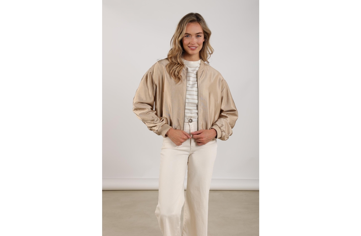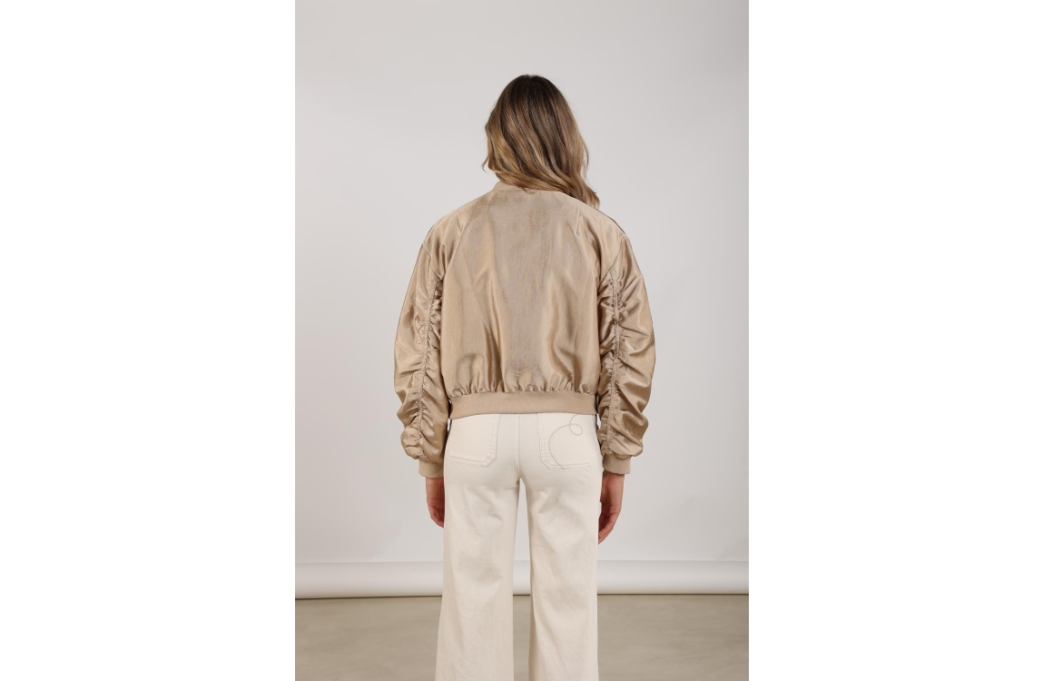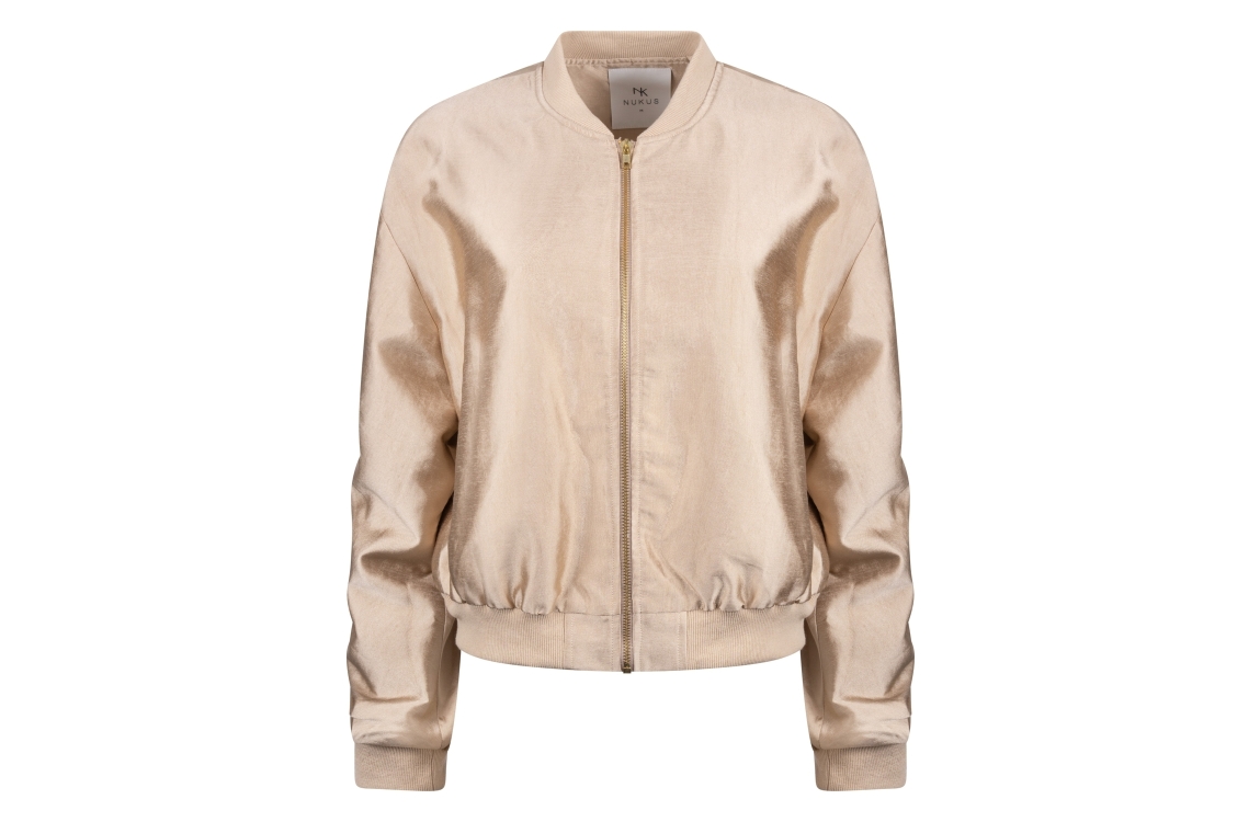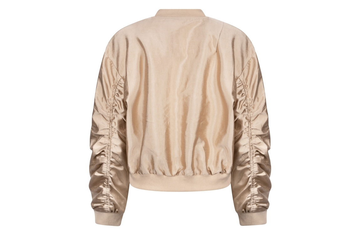 NUKUS Babette Bomber 4 gold. Dit bomber model is voorzien van een ronde hals en heeft lange mouwen. Deze goud kleurige bomber van Nukus sluit door middel van een rits en heeft twee steekzakken aan de voorzijde. Dit model is afgewerkt met boorden en heeft een gedrappeerd detail op de mouwen.