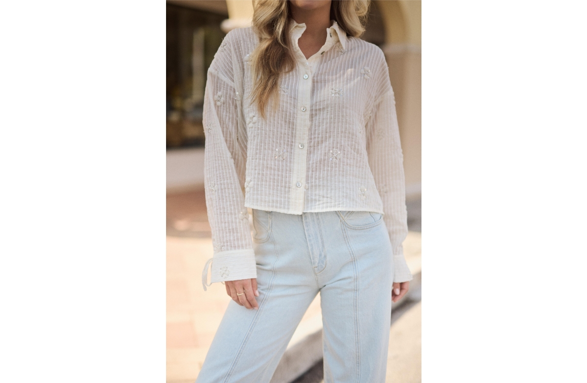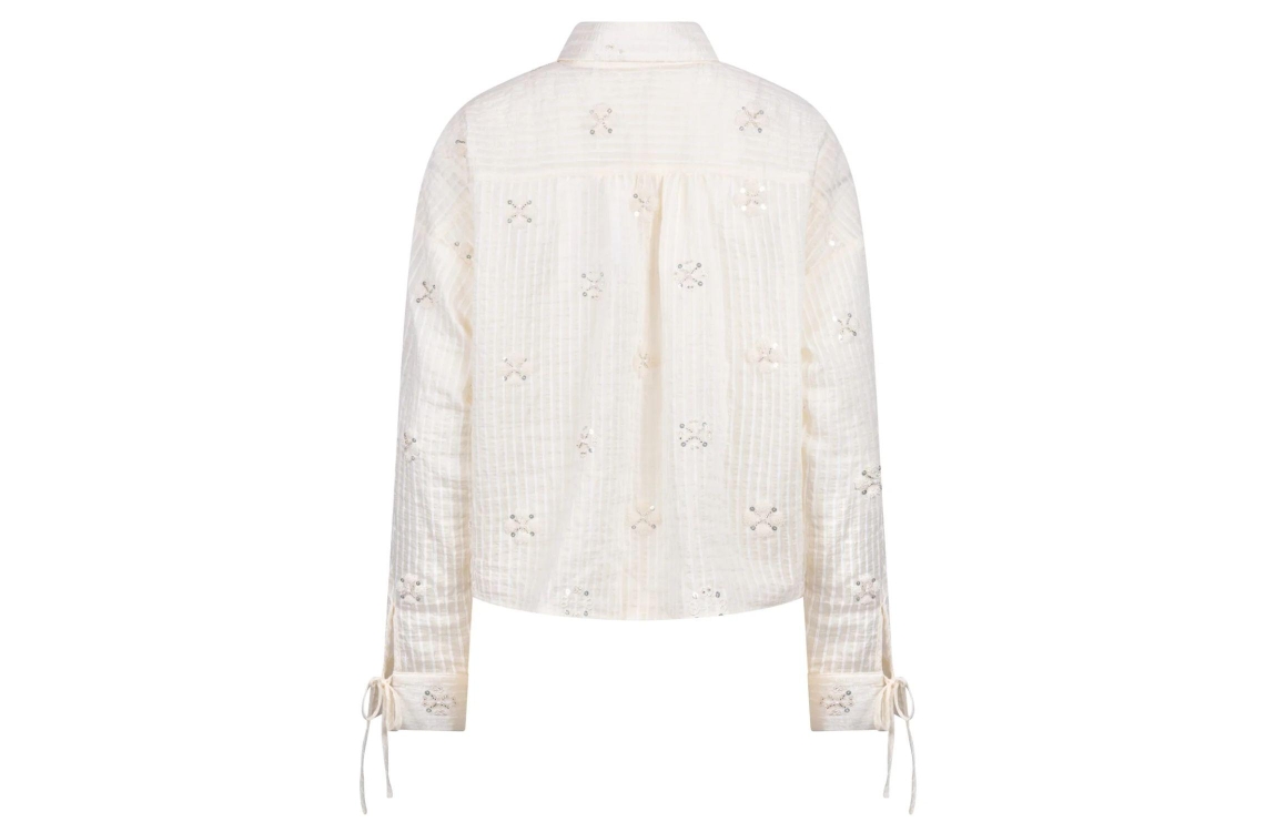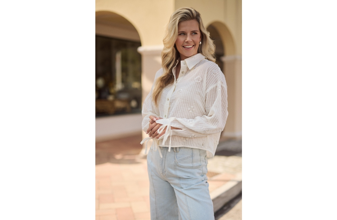 NUKUS Bailey Blouse Beads 17 off white. Dit rechtvallende model heeft een kraag en lange mouwen. Deze gebroken witte blouse van NUKUS sluit door middel van knopen en is een iets korter model. Dit model is bewerkt met een subtiel streepmotief met borduur en pailletten. Deze blouse is afgewerkt met een strikdetail bij de machetten.