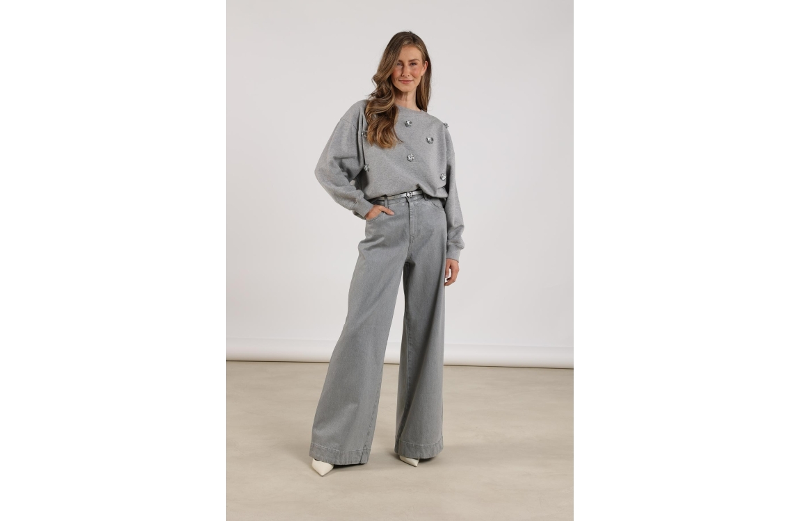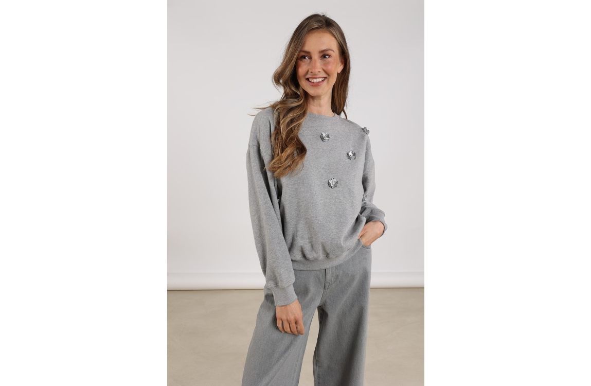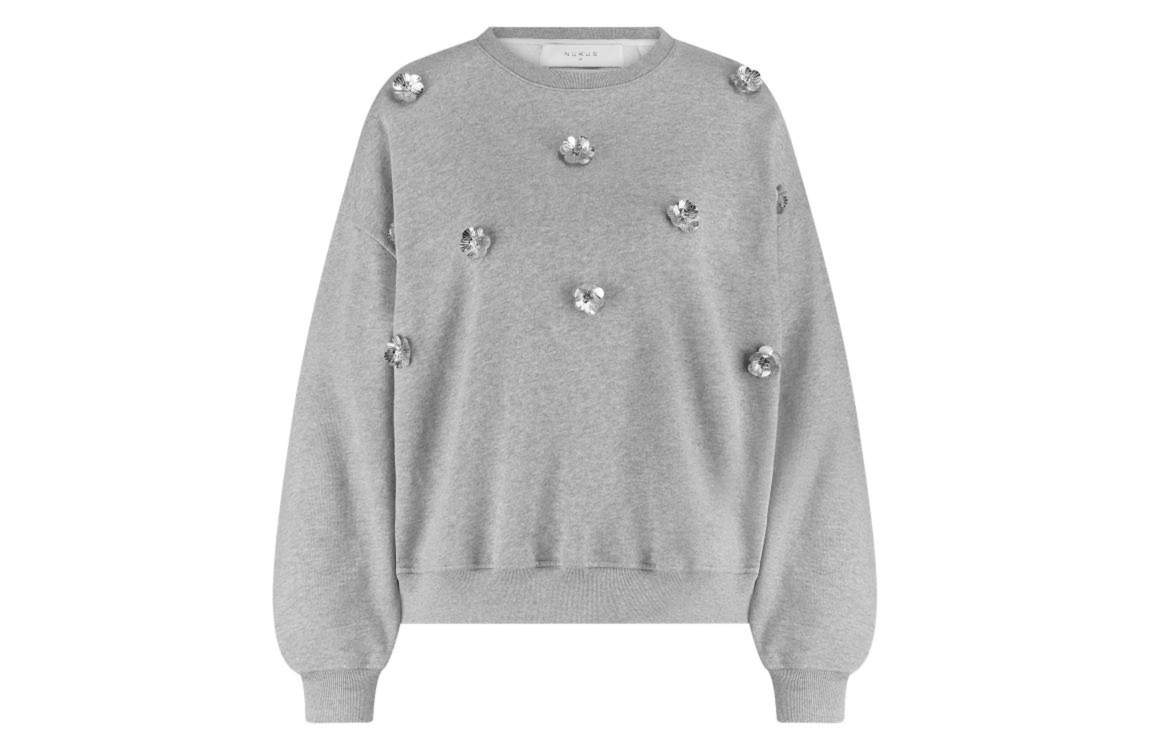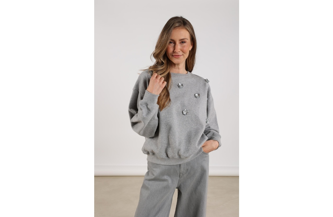 NUKUS Beatriz Pullover Flower NKF03021. Dit oversized model heeft een ronde hals en lange mouwen. Deze grijze pullover van Nukus is all over bewerkt met zilveren 3D bloemen en afgewerkt met elastische boorden aan de onderzijde.