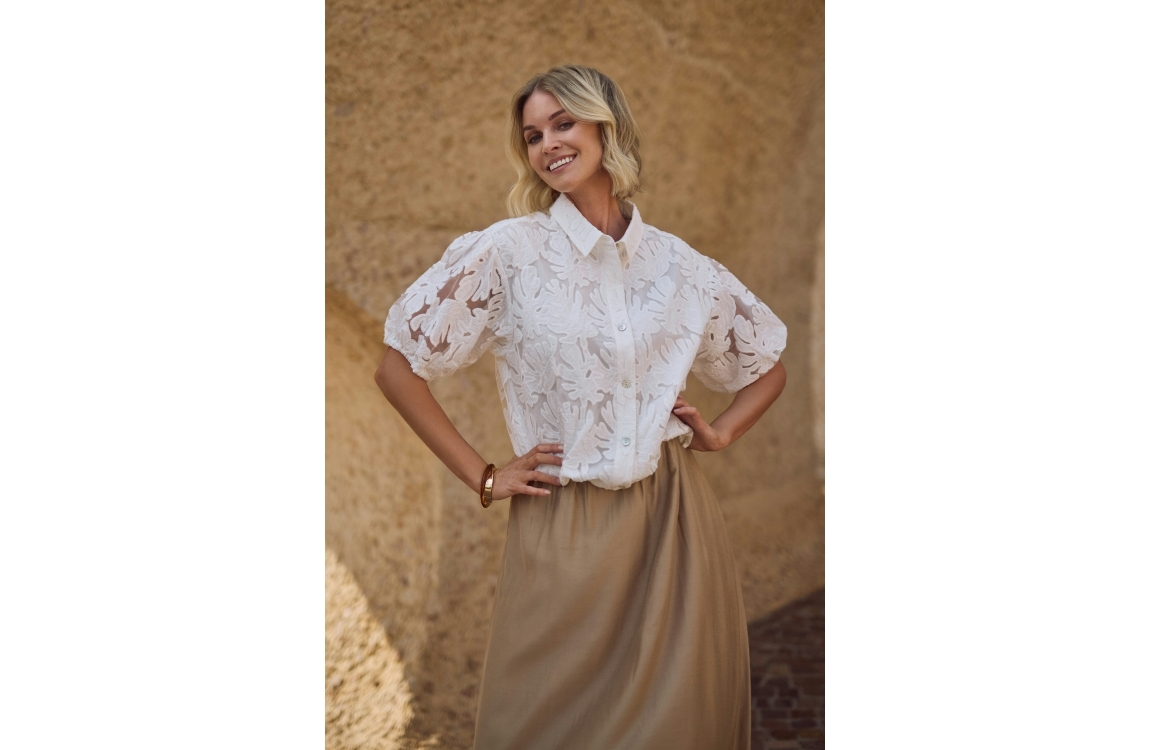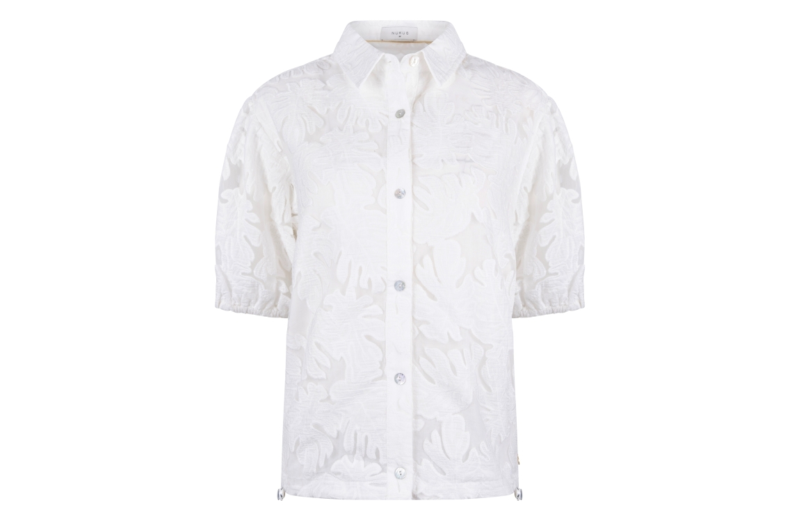 NUKUS Berit Blouse Embroidery 17 off white. Dit rechtvallende model is voorzien van een kraag en heeft korte pofmouwen. Deze witte blouse van Nukus sluit door middel van knopen en is bewerkt met een ubtiele bloemprint in embroidery. Aan de onderkant van de blouse zit elastiek die verstelbaar is.