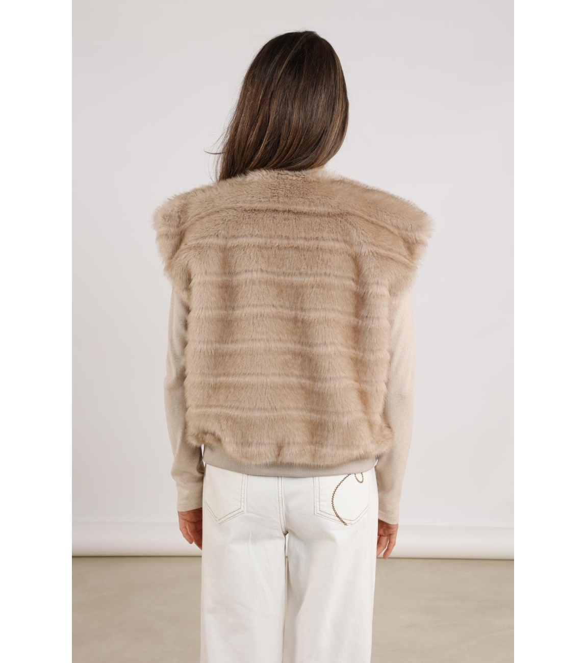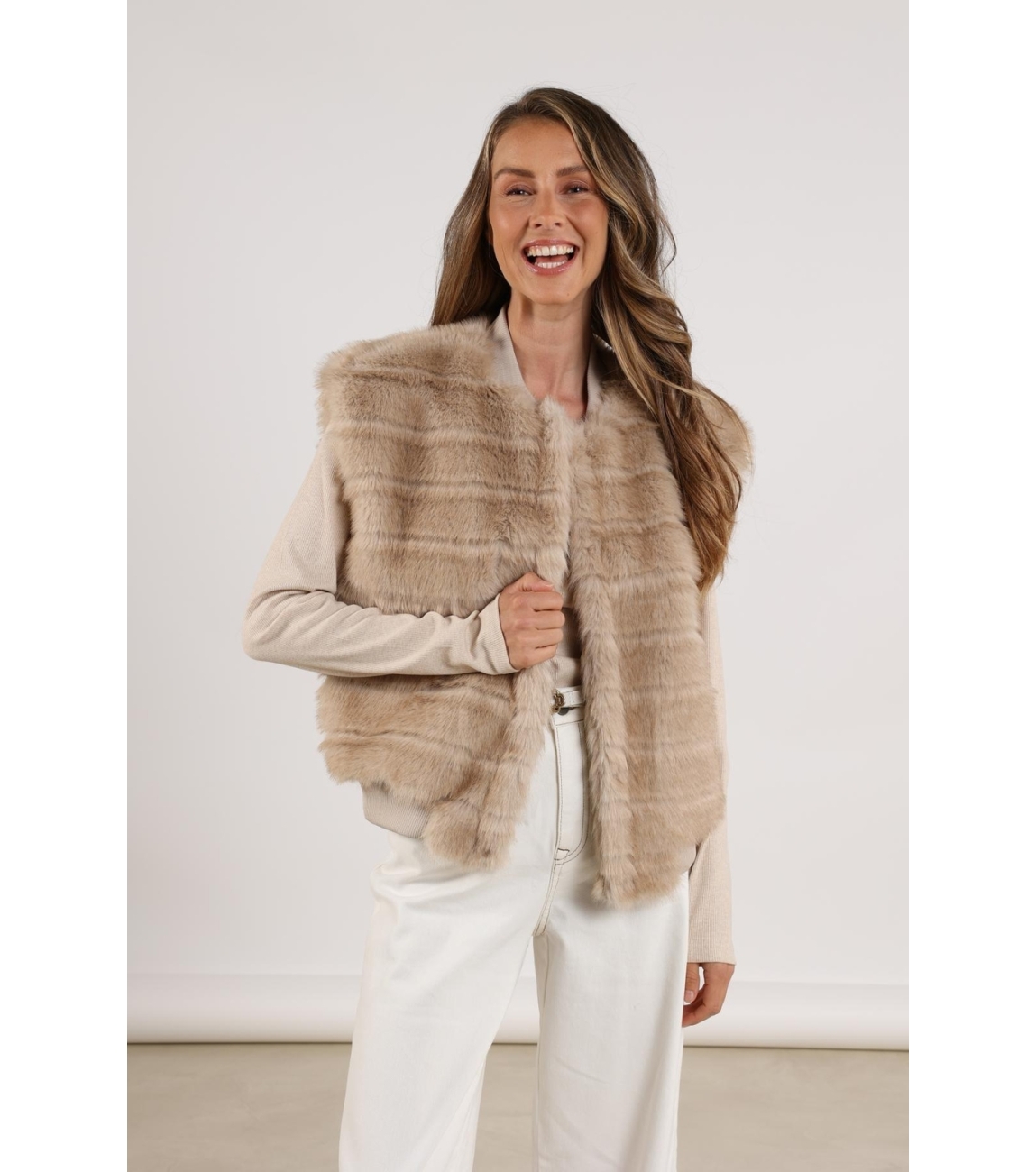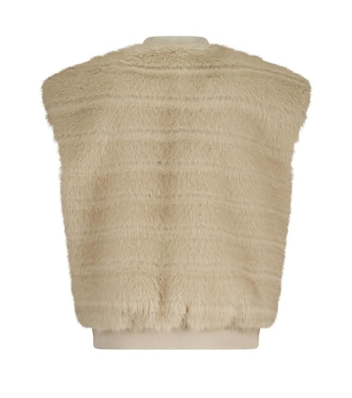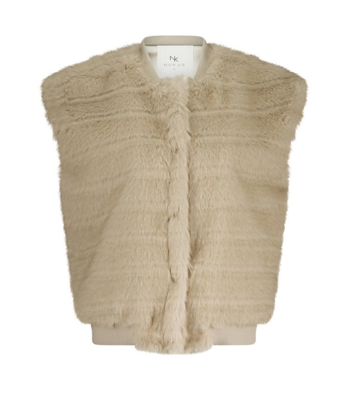NUKUS gilet Billy NKF08011. Dit rechtvallend model is voorzien van een ronde hals en is mouwloos. Deze beige faux fur gilet van Nukus sluit door middel van knopen en is afgewerkt met elastische boorden.