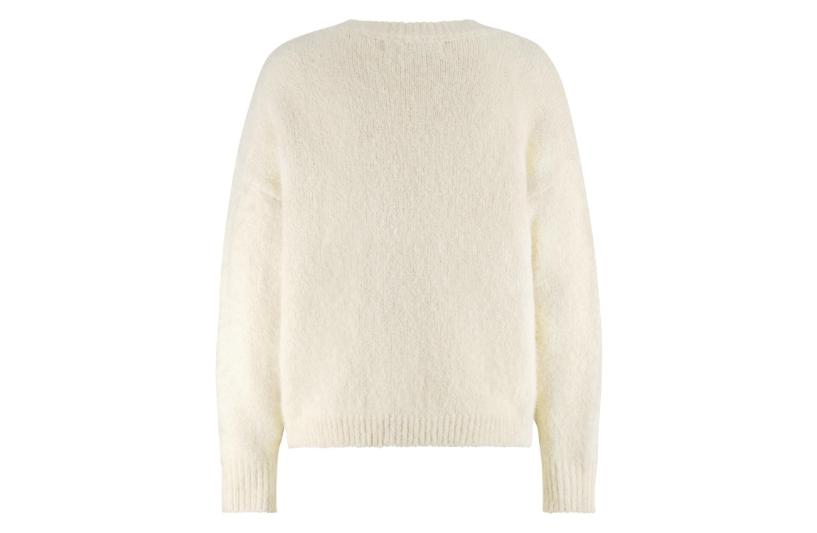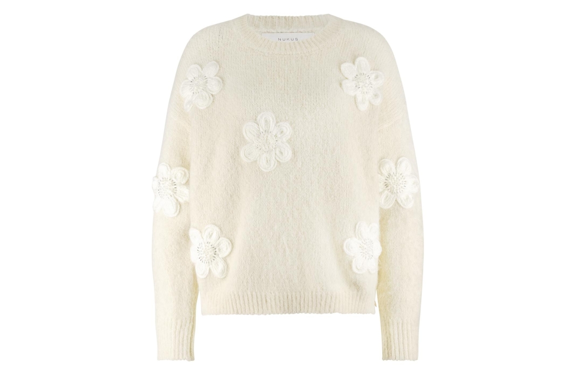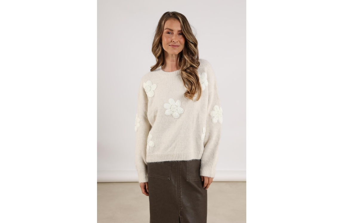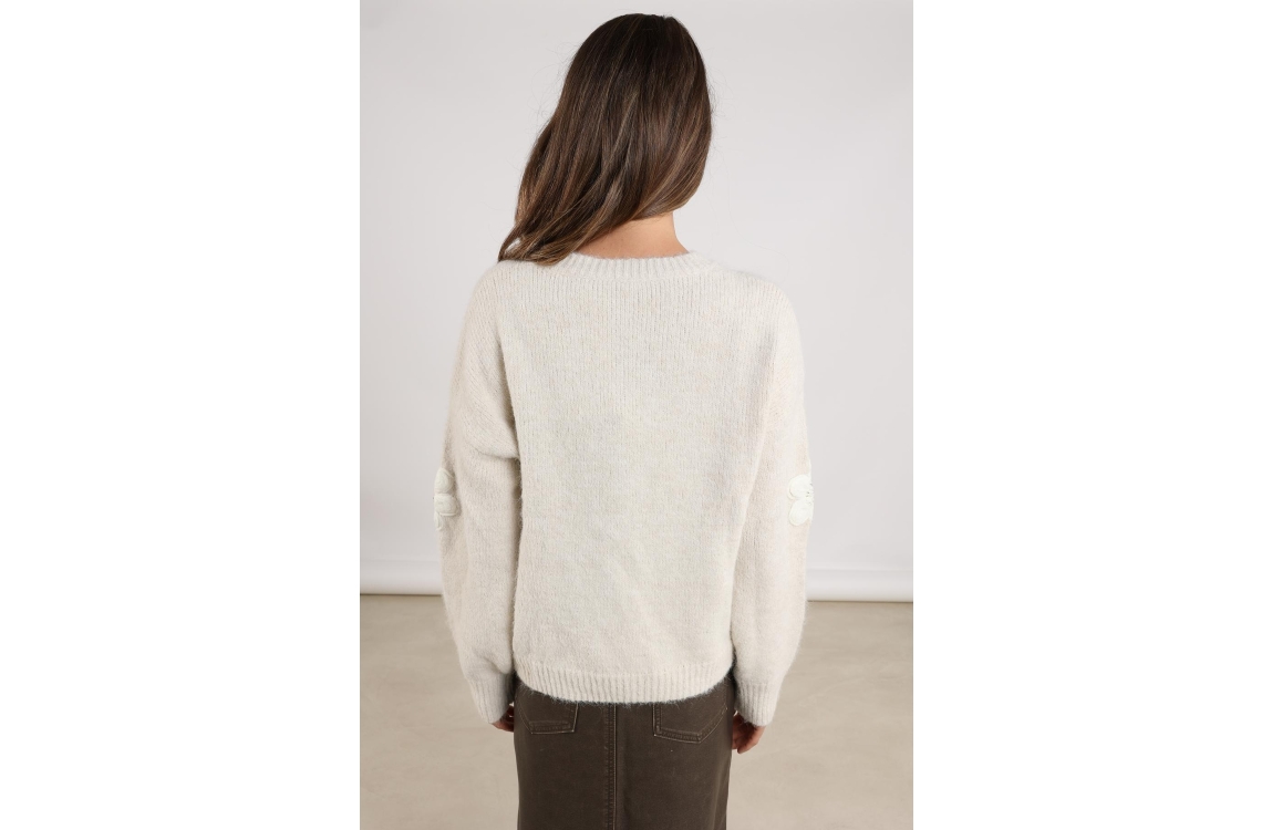 Nukus Chiaca pullover NKF03034. Dit rechtvallend model is voorzien van ronde hals en heeft lange mouwen. Deze gebroken witte pullover van Nukus is aan de voorzijde bewerkt met geborduurde bloemen afgewerkt met parels.