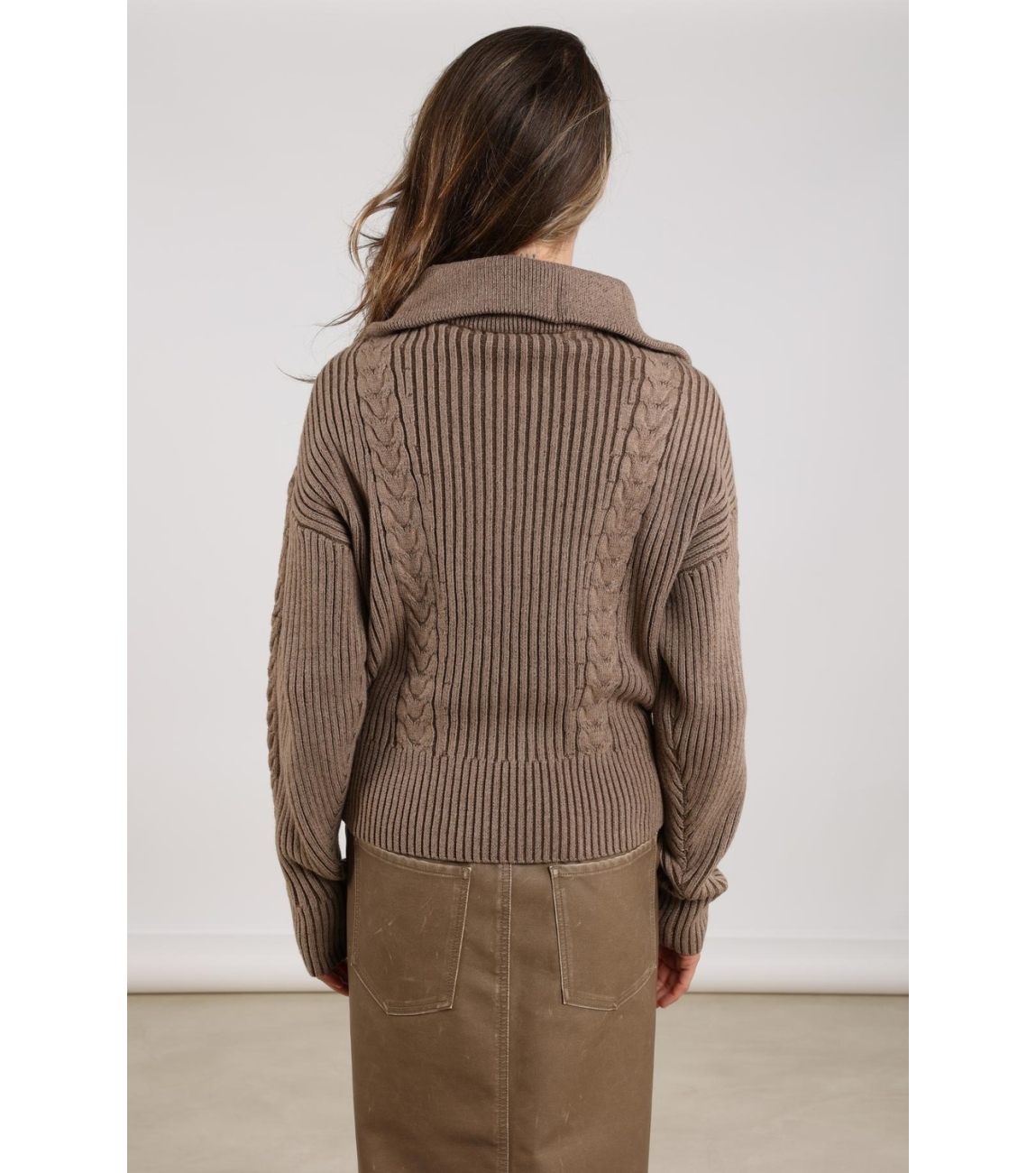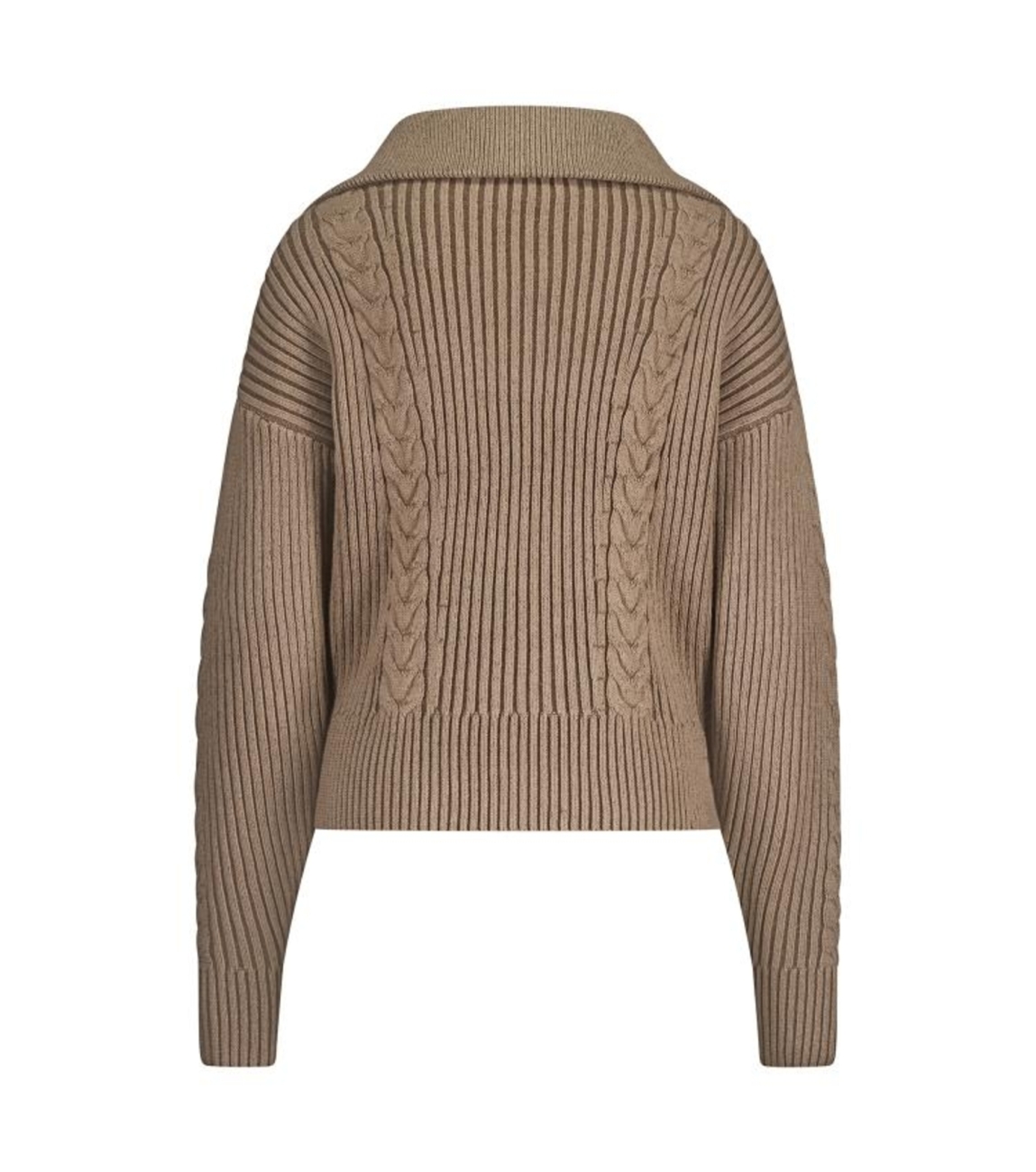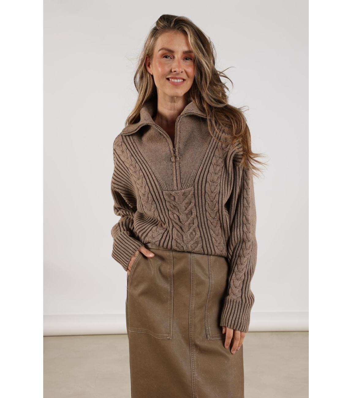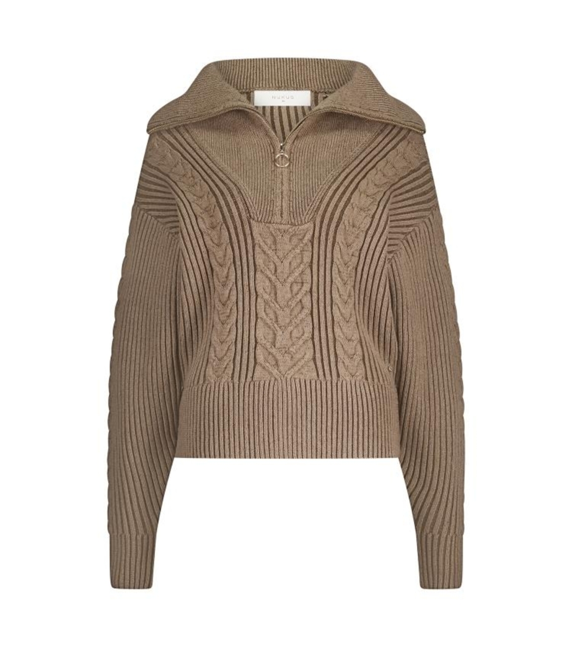 Nukus pullover Clair NKF03025. Dit rechtvallend model is voorzien van een opstaande kraag dat sluit door middel van een rits en heeft lange mouwen. Deze bruine pullover van Nukus is bewerkt emt een gevlochten kabel structuur all-over.
