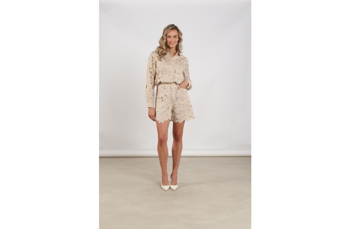 NUKUS Dagmar Short Flower 239 sand/gold. Dit rechtvallende model sluit door middel van een knoop en rits afgewerkt met ceintuurlussen. Deze bruine short van Nukus is afgewerkt met elastiek aan de achterkant. Dit model is all-over bewerkt met opengewerkte bloemenprint en een lurex.