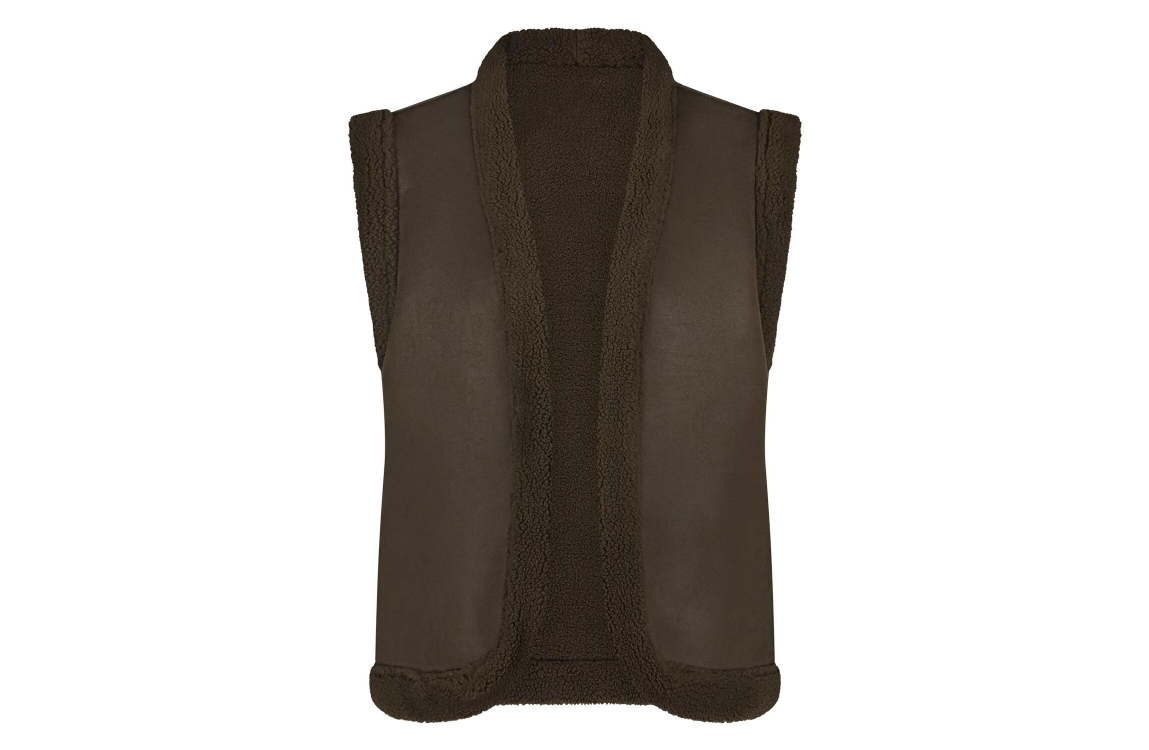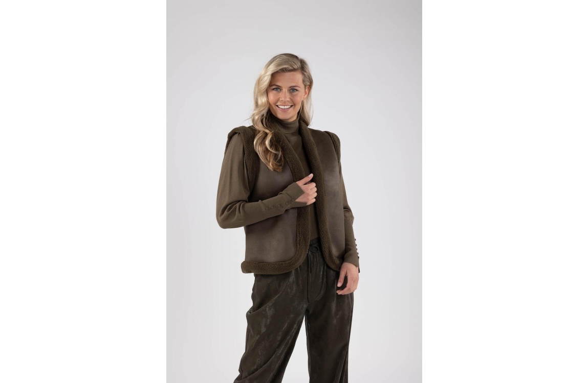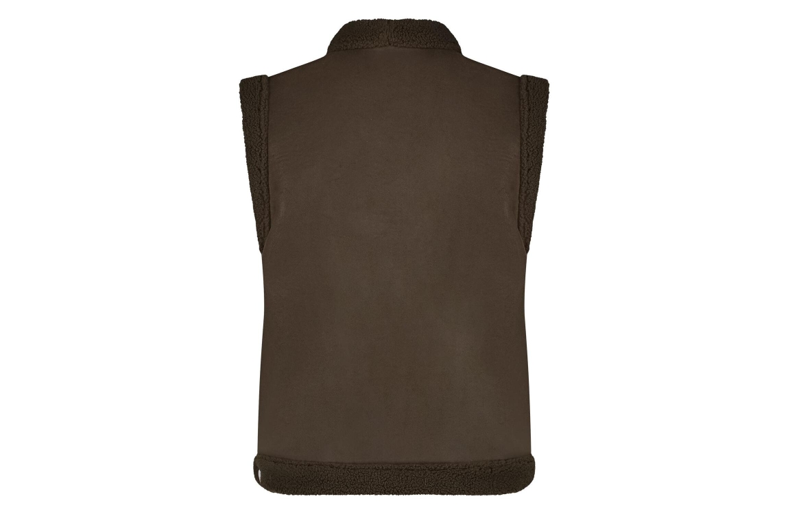 Nukus gilet Elise FW24185. Dit rechtvallend model valt open en is mouwloos. Deze omkeerbare gilet van Nukus is aan een zijde bewerkt met een leren-look en de andere zijde is bewerkt met een teddy-look.