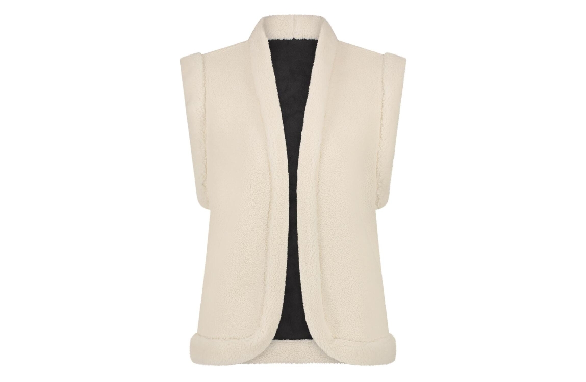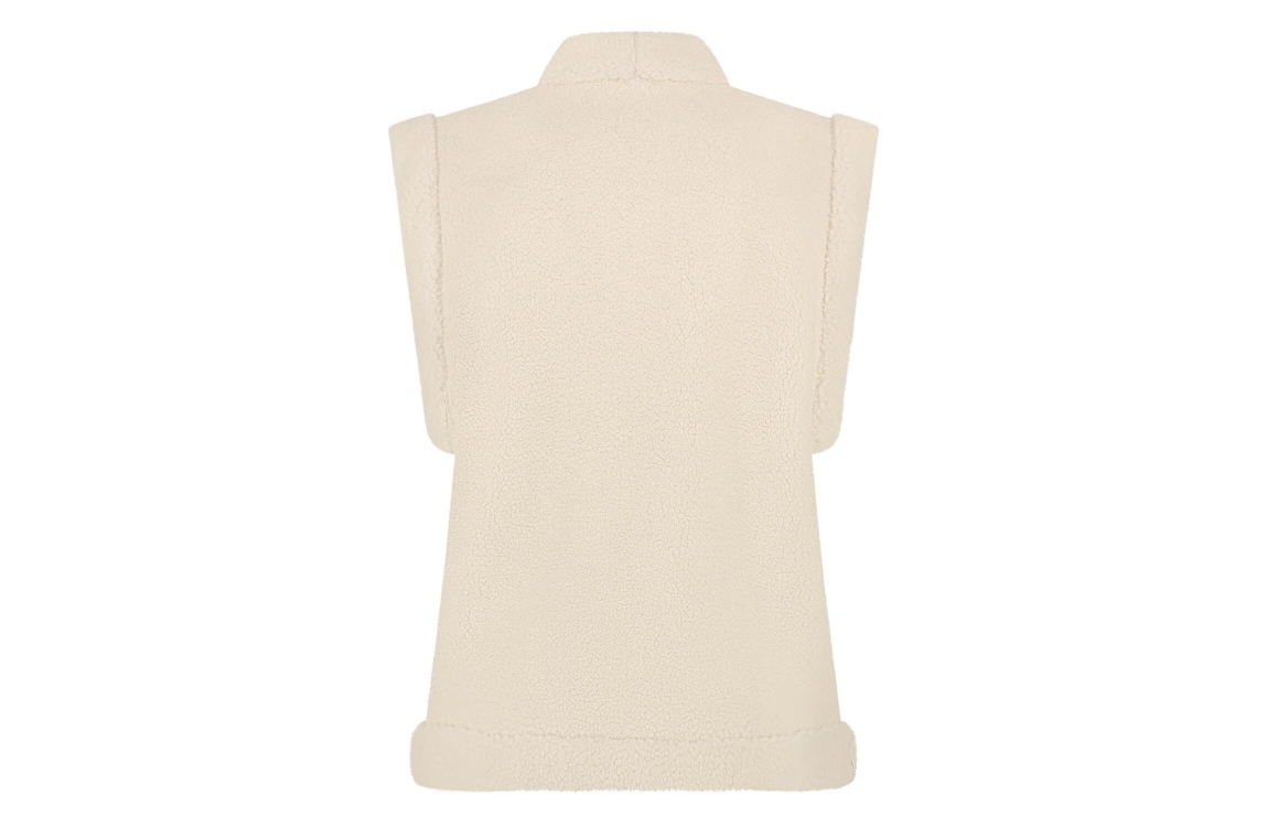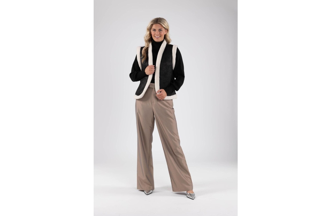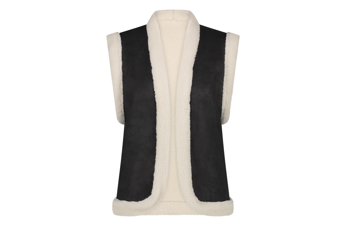 Nukus gilet Elise. Dit rechtvallend model is voorzien van een ronde hals en is mouwloos. Deze zwarte/offwhite gilet is reversible, waarbij de ene zijde uitgevoerd is een teddy kwaliteit en de andere zijde in een suedine kwaliteit.