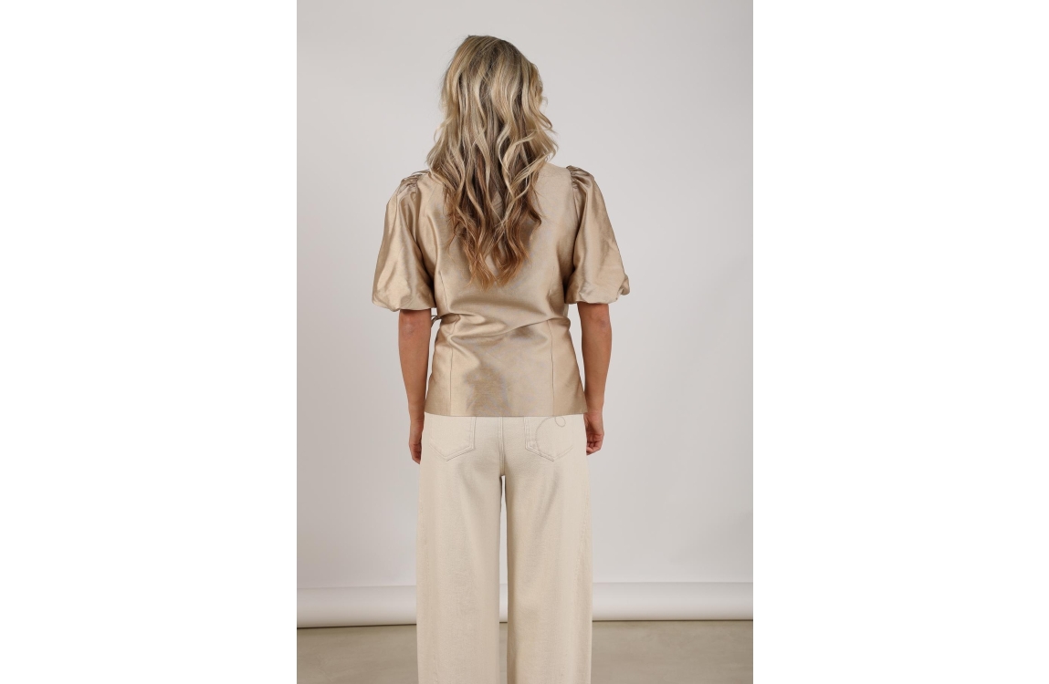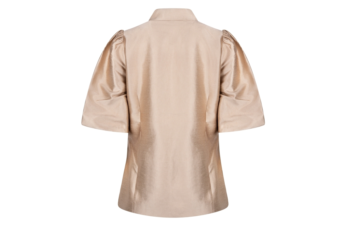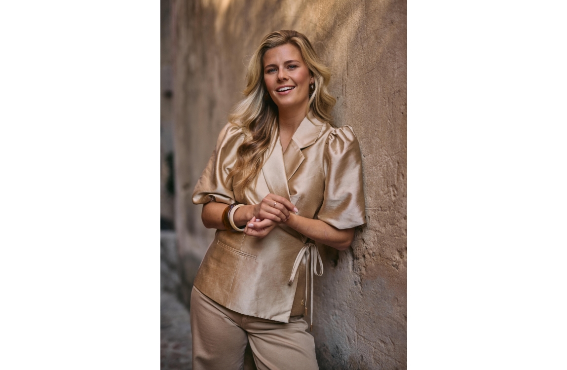 NUKUS Fabienne Blazer 4 gold. Dit rechtvallende model is voorzien van een reverskraag en heeft korte pofmouwen. Deze goud kleurige blazer van Nukus sluit door middel van een striksluiting aan de voorkant. Dit model is bewerkt met een satijnglans.