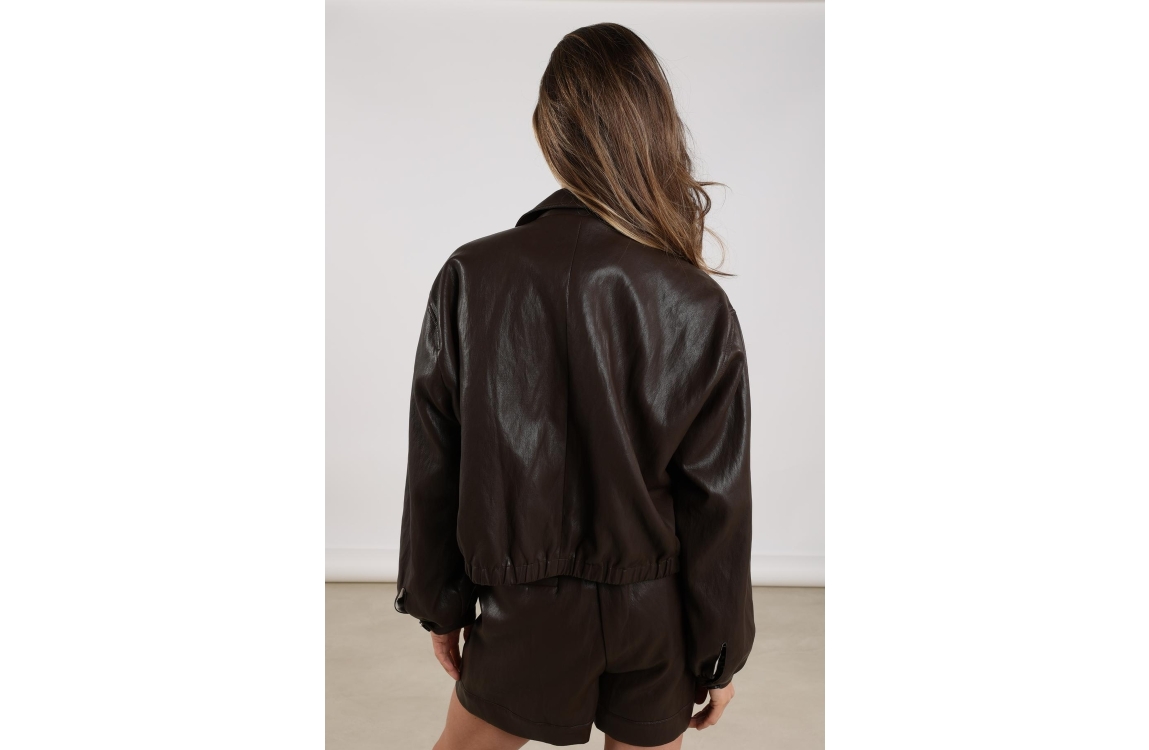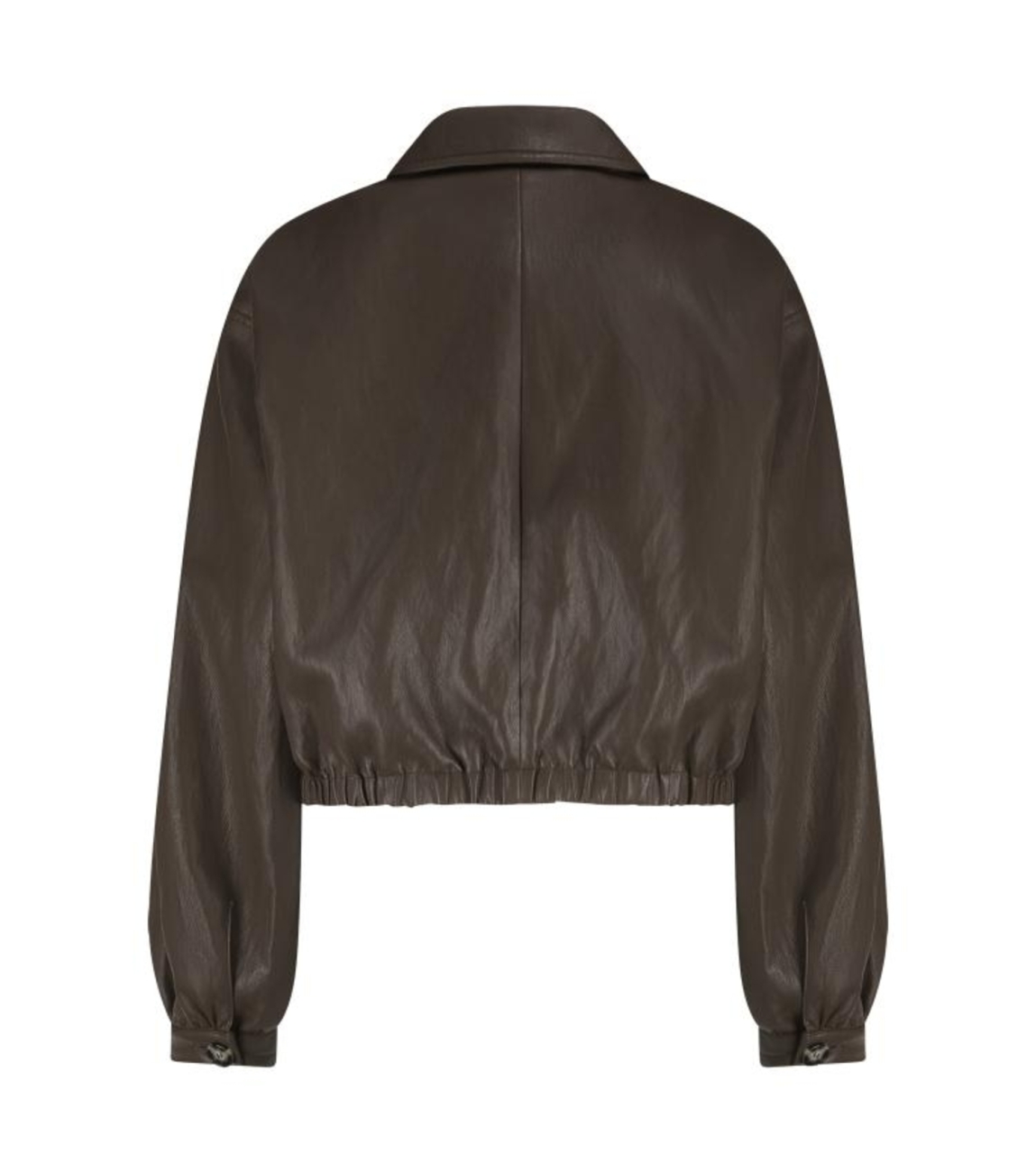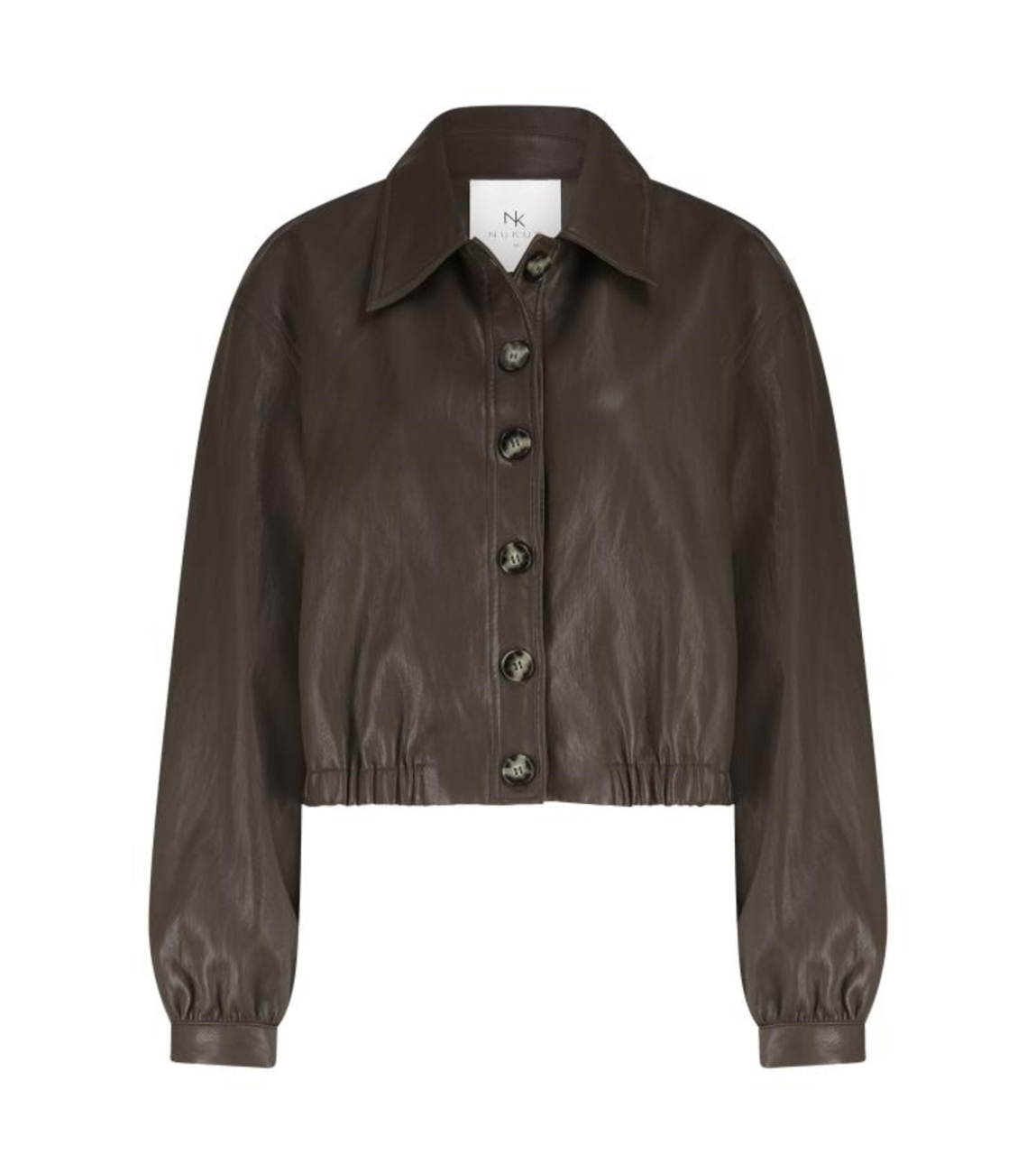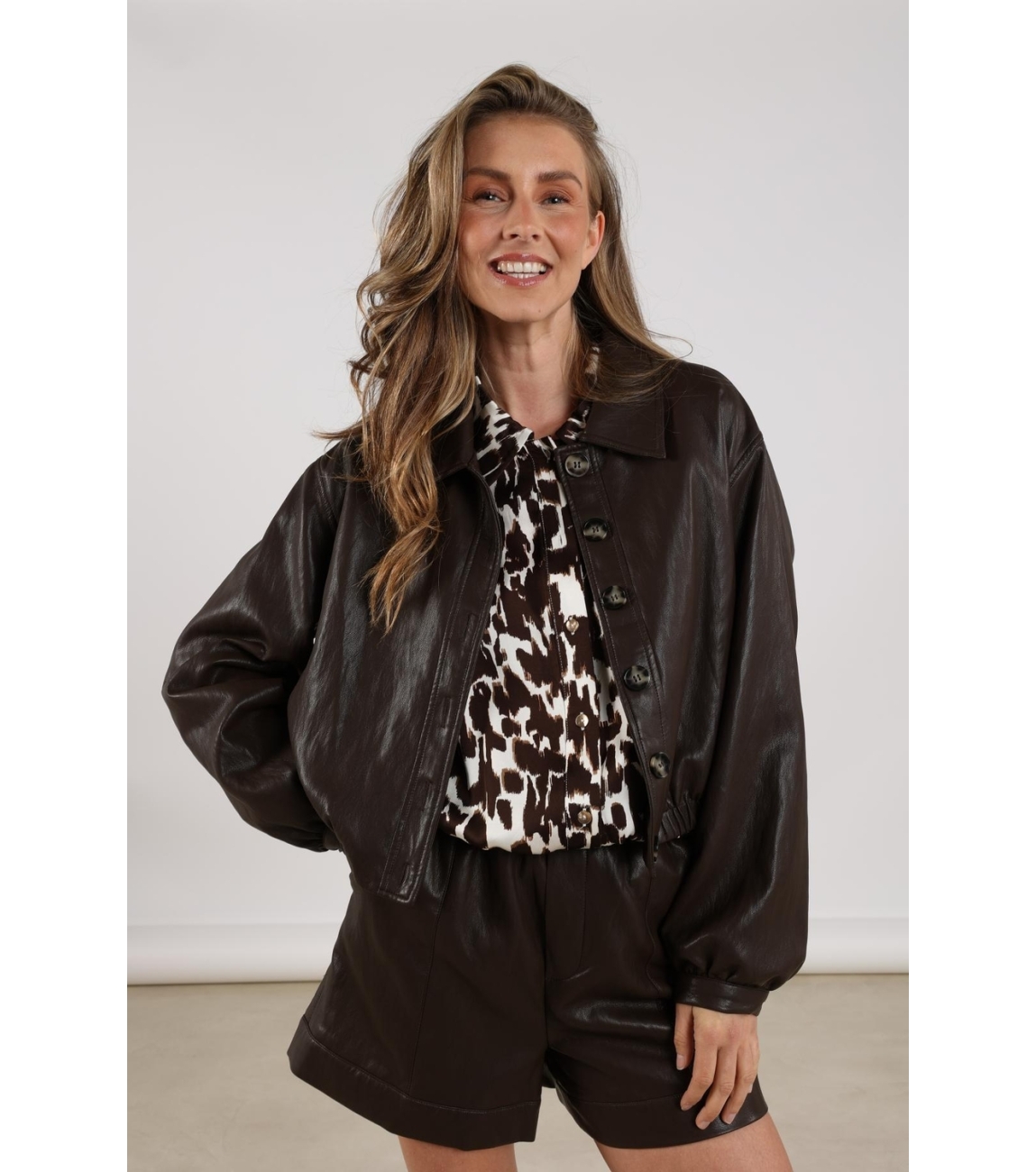 Nukus jasje Fiene NKF13026. Dit wijdvallend model is voorzien van een kraag en heeft lange mouwen. Deze bruine fake leather jasje van Nukus sluit door middel van knopen en is voorzien van twee steekzakken.