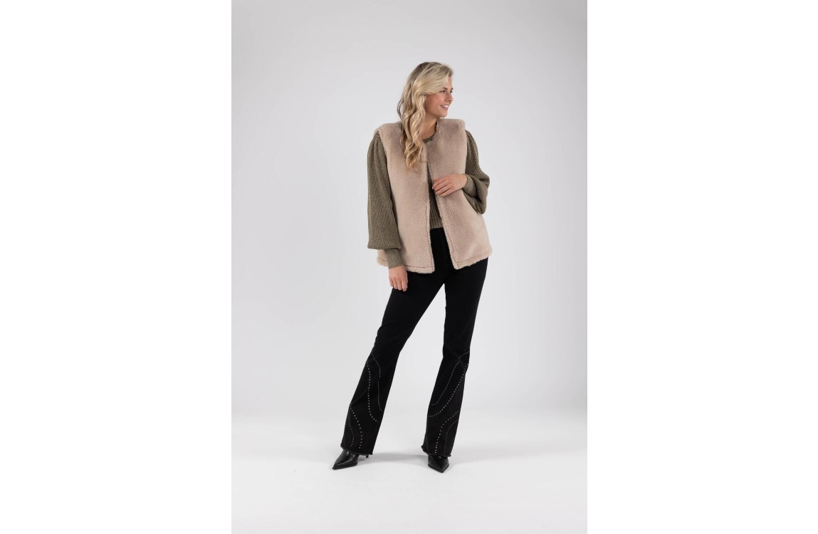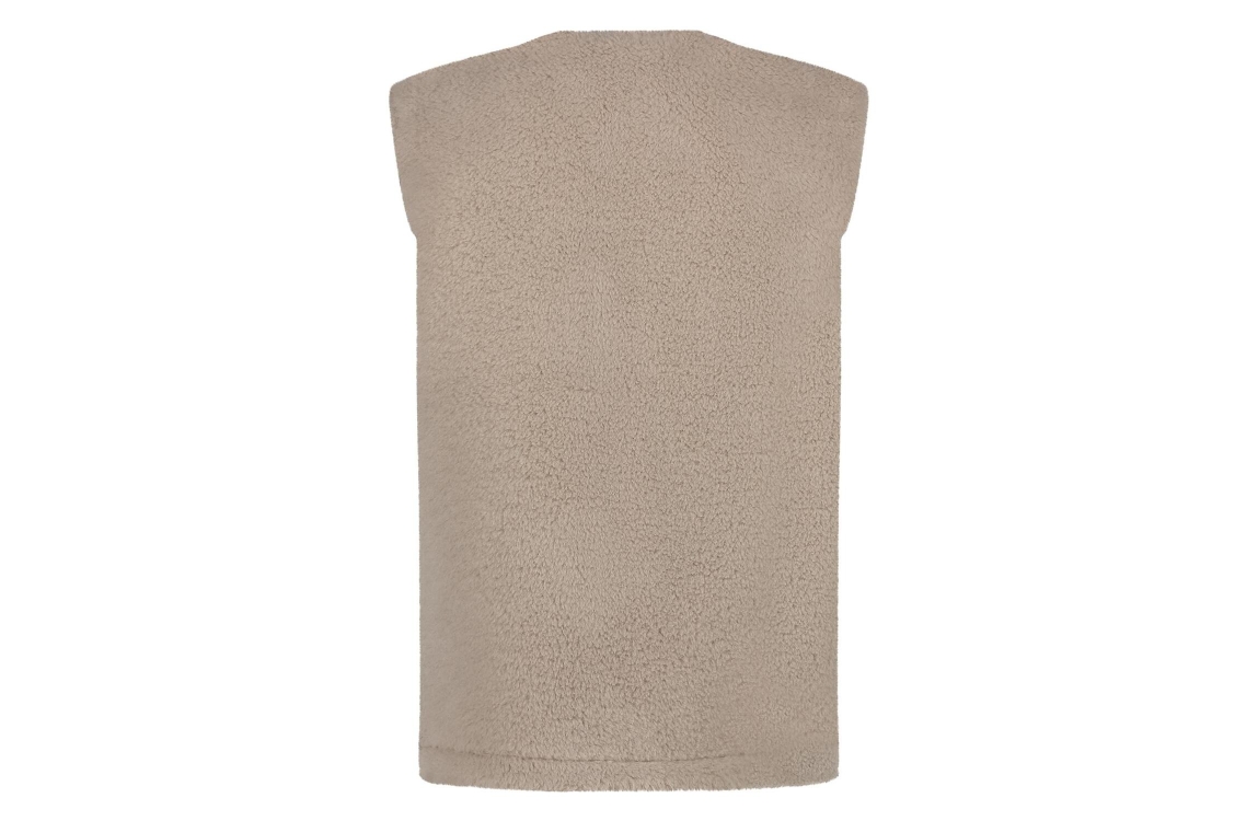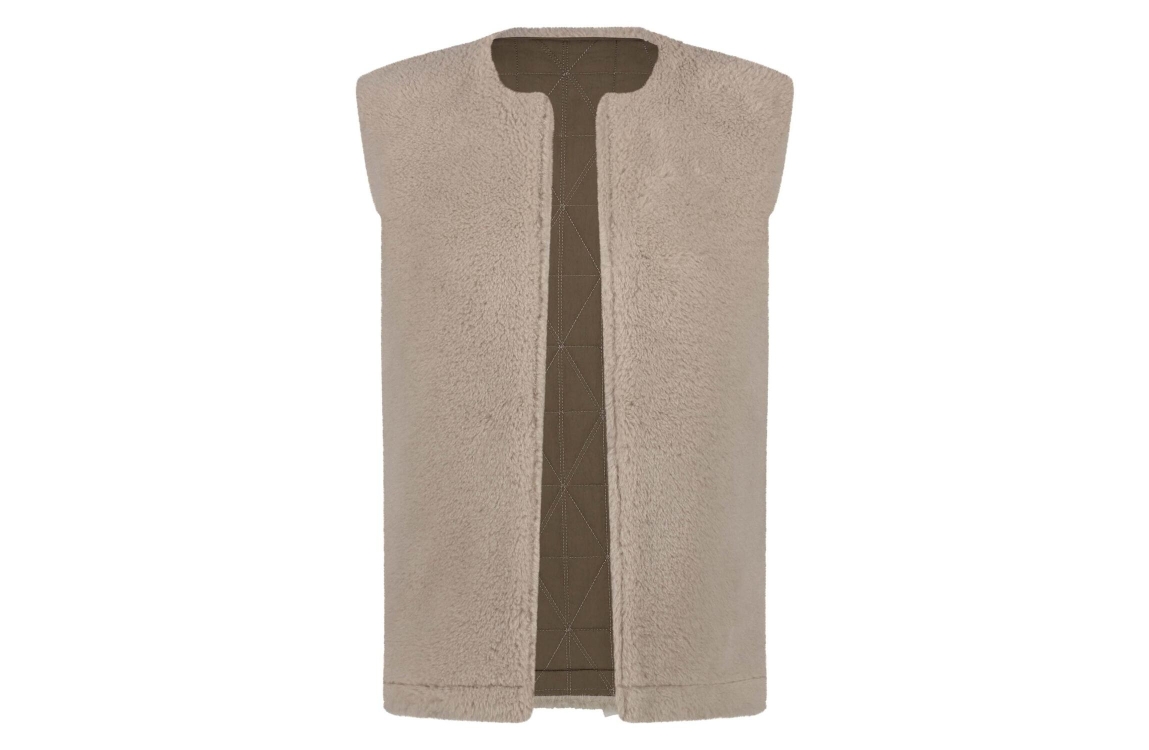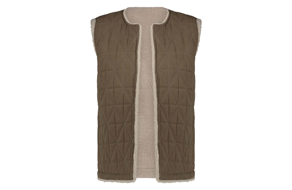 NUKUS jillian gilet fw241811. Dit rechtvallende model heeft een ronde hals en is mouwloos. Dit bruine gilet van Nukus is reversible en biedt twee looks in één: aan de ene kant zacht en knus teddy stof, en aan de andere kant een opvallend driehoekpatroon.