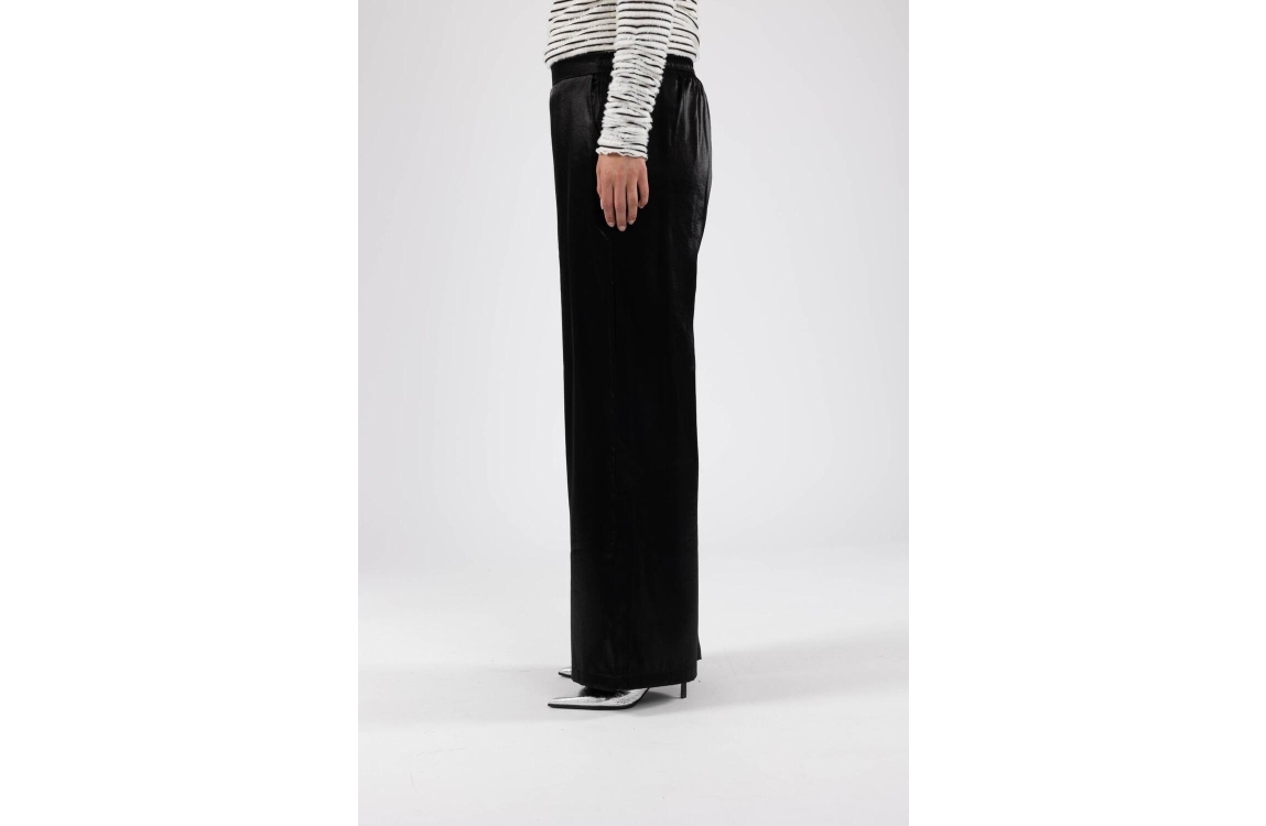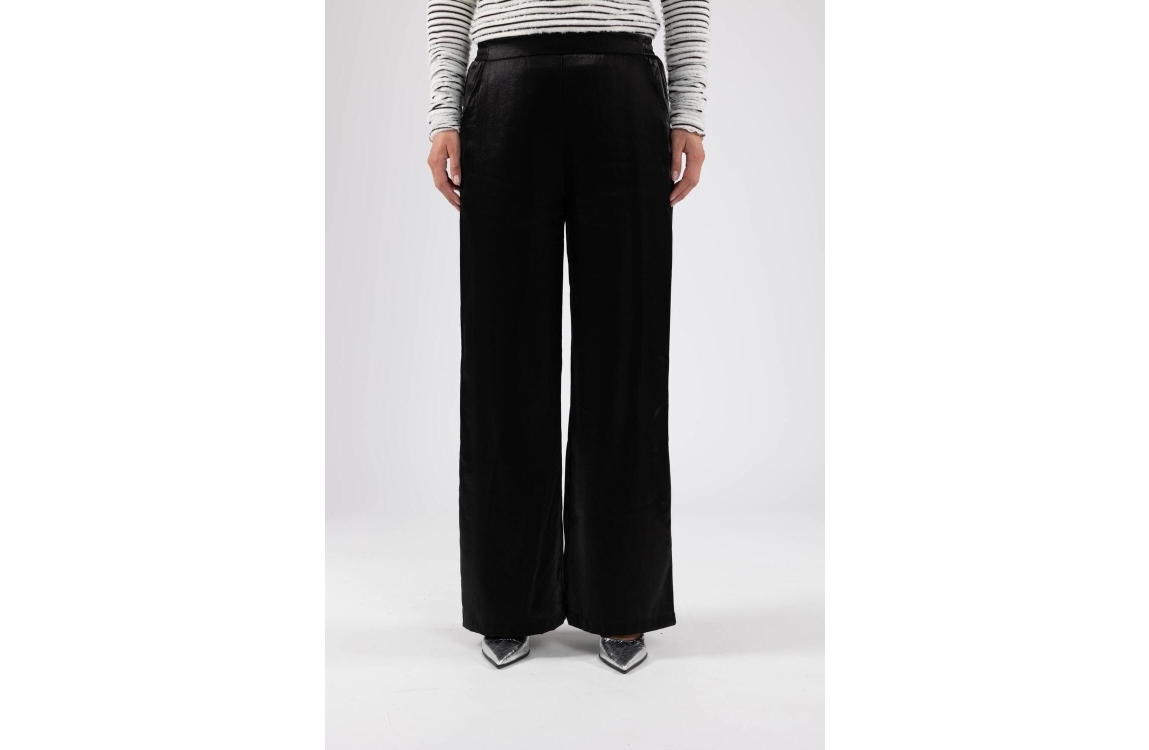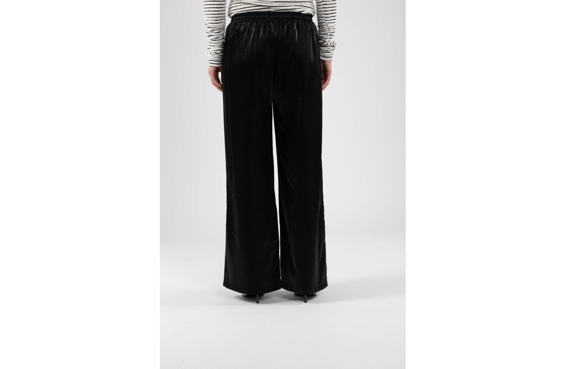 Nukus broek Josephine. Dit wijdvallende model is voorzien van een elastische tailleband en heeft lange pijpen. Deze zwarte broek van Nukus is uitgevoerd in een glanzende stof en is voorzien van twee schuine steekzakken.
