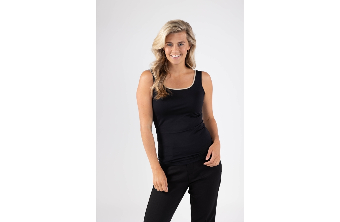 NUKUS Juba Singlet 169 black/gold. Dit aangesloten model is voorzien van een ronde hals met brede bandjes en is mouwloos. Deze zwarte singlet van Nukus is afgewerkt met een subtiel lurex randje.