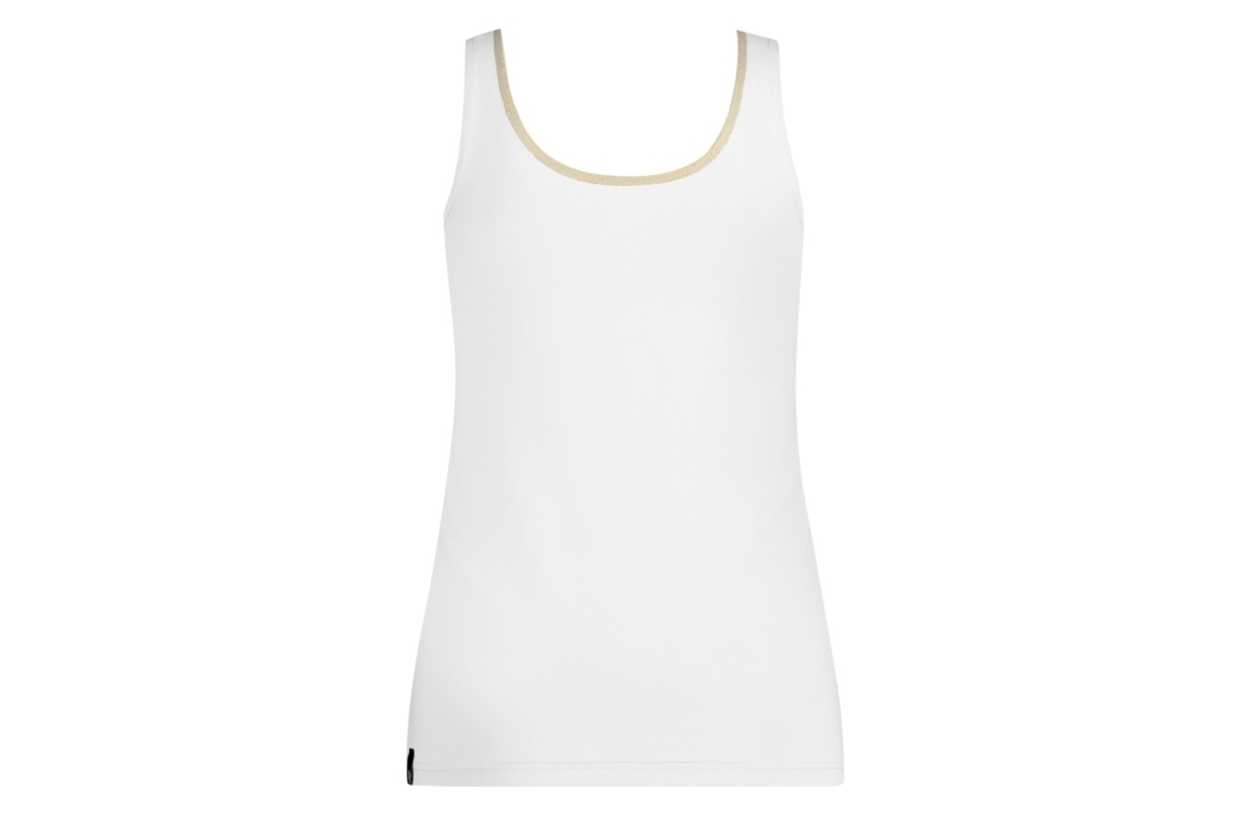 NUKUS Juba Singlet 262 White/gold. Dit aangesloten model is voorzien van een ronde hals met brede bandjes en is mouwloos. Deze witte singlet van Nukus is afgewerkt met een subtiel lurex randje.